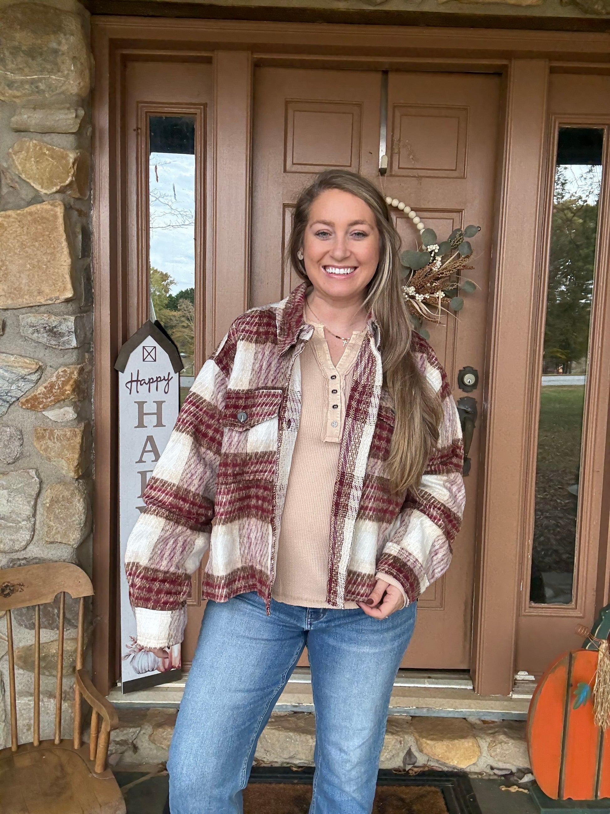 This stunning jacket is even more beautiful in person. It has a soft brushed plaid design with functional buttons and pockets. It is soft but will also keep you warm. It is slightly oversized and has a boxy fit so it is great to layer with your favorite Henley or even sweaters. We have it paired with our new Pecan Pie Henley