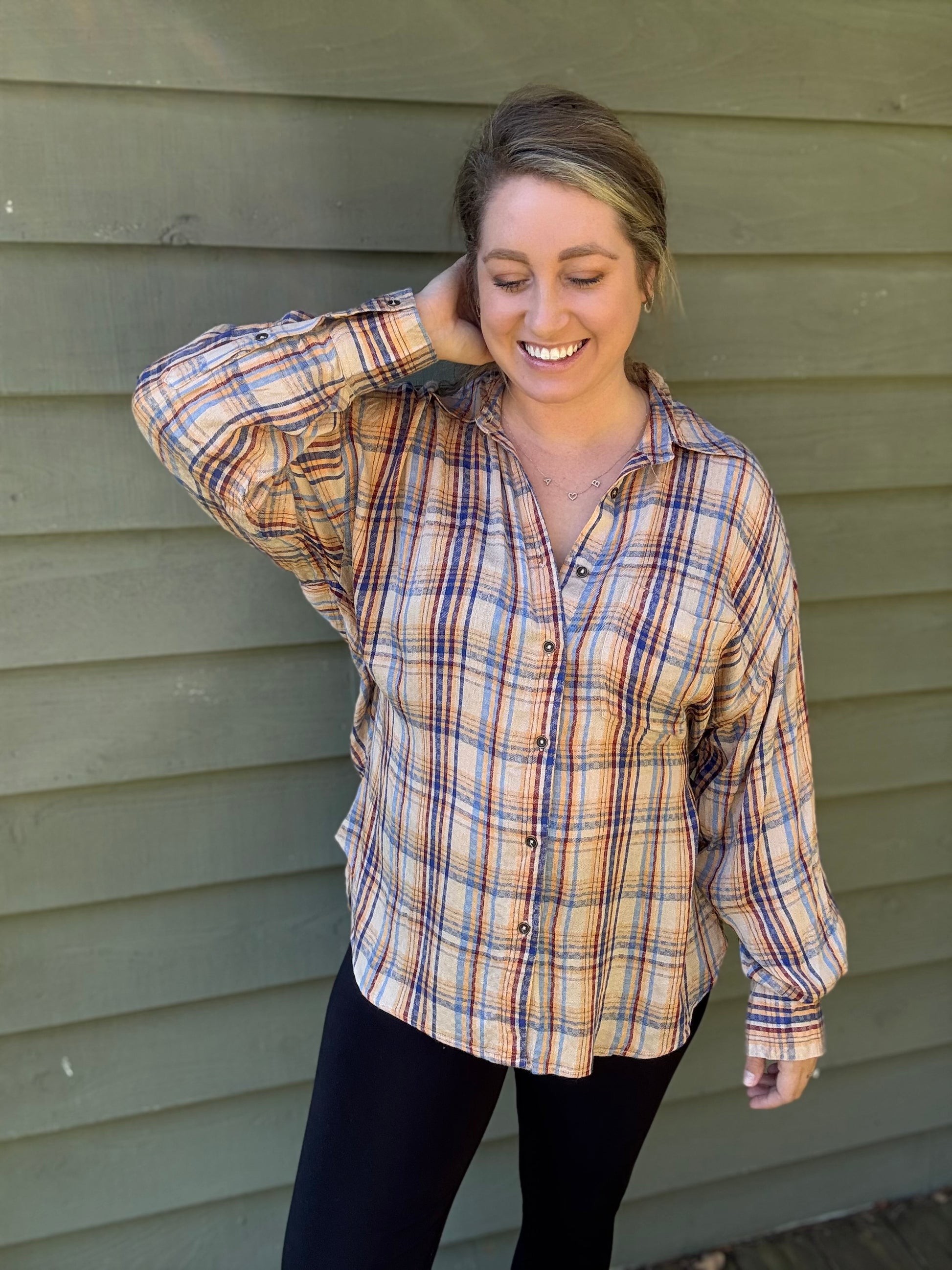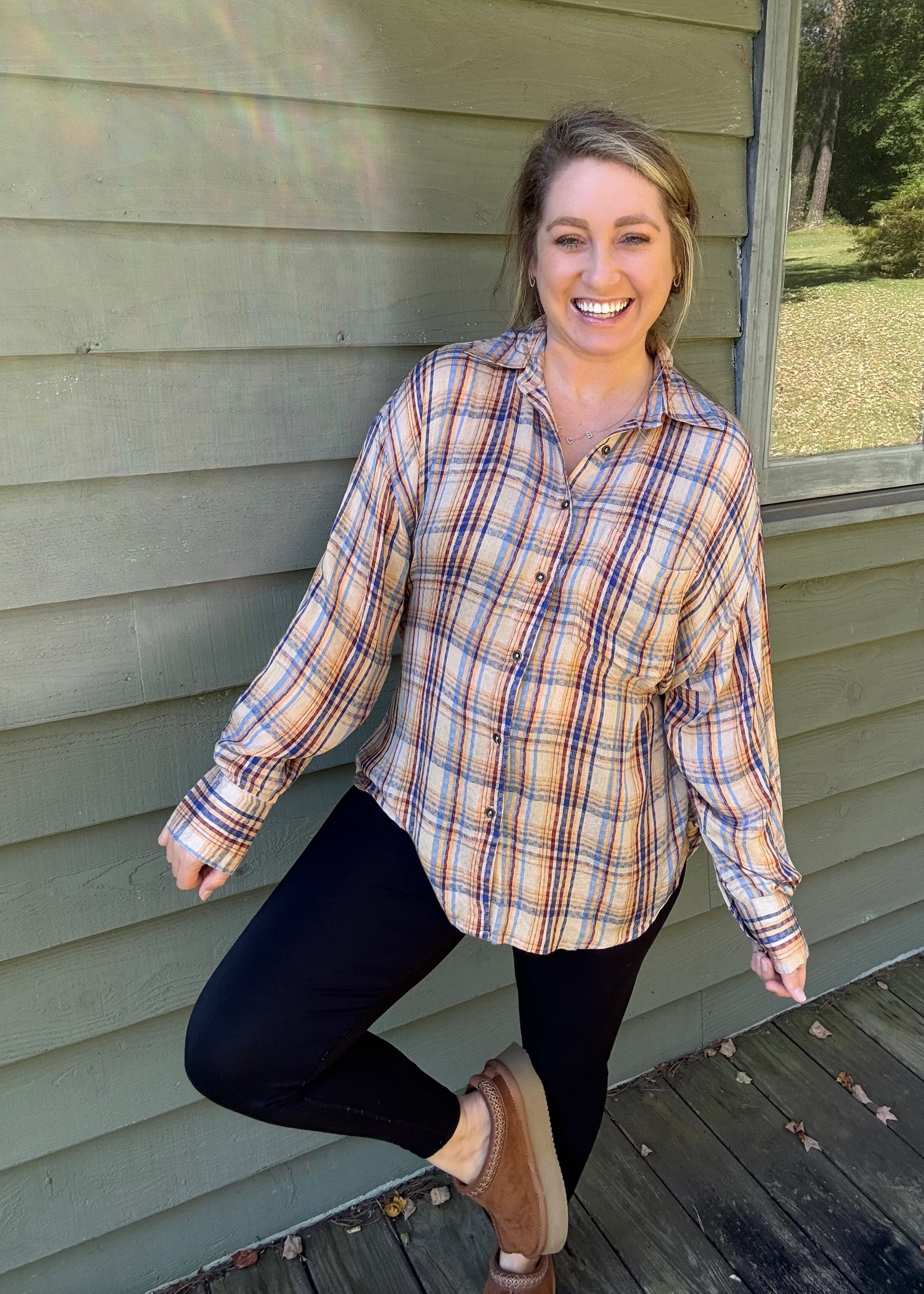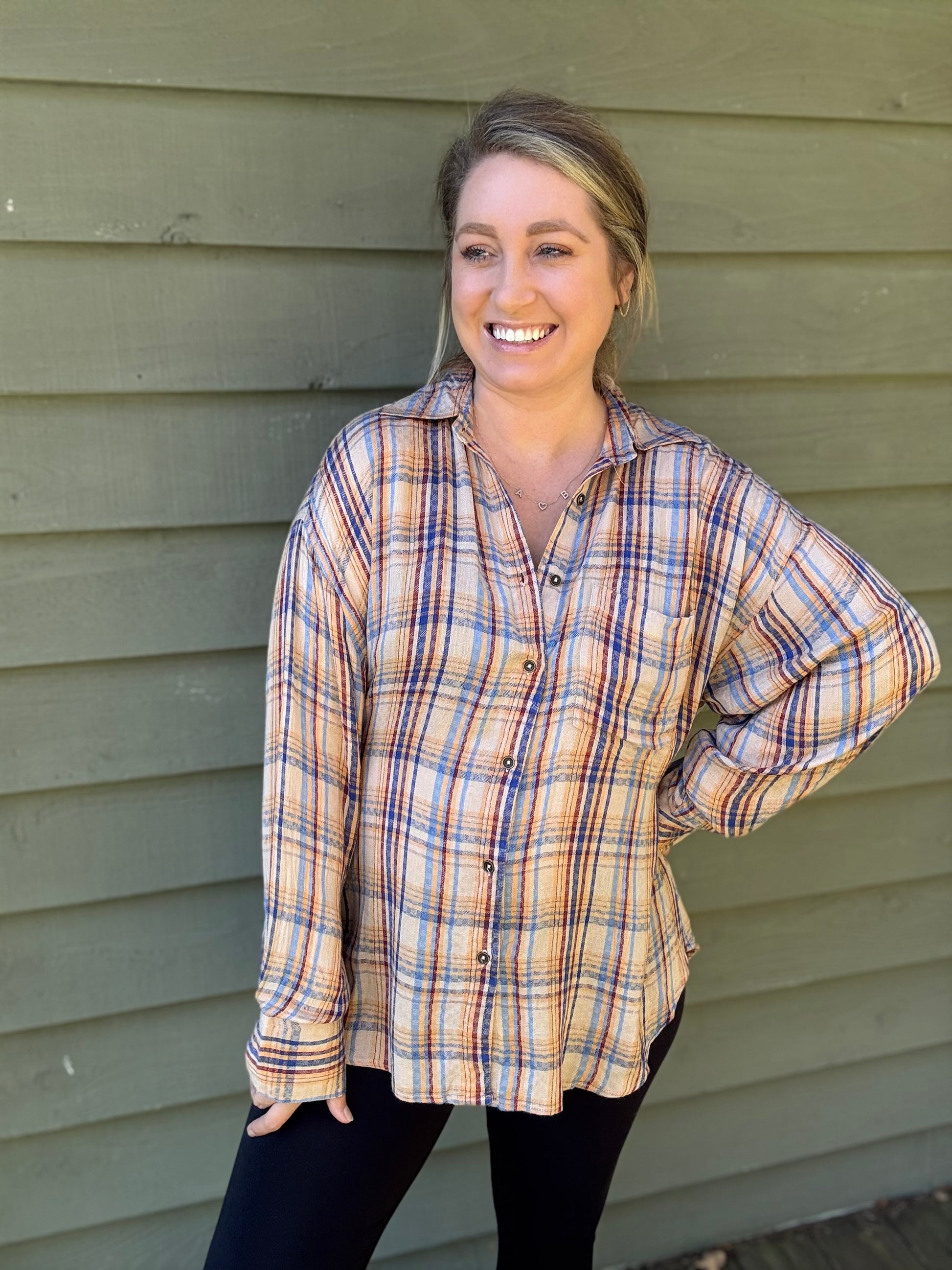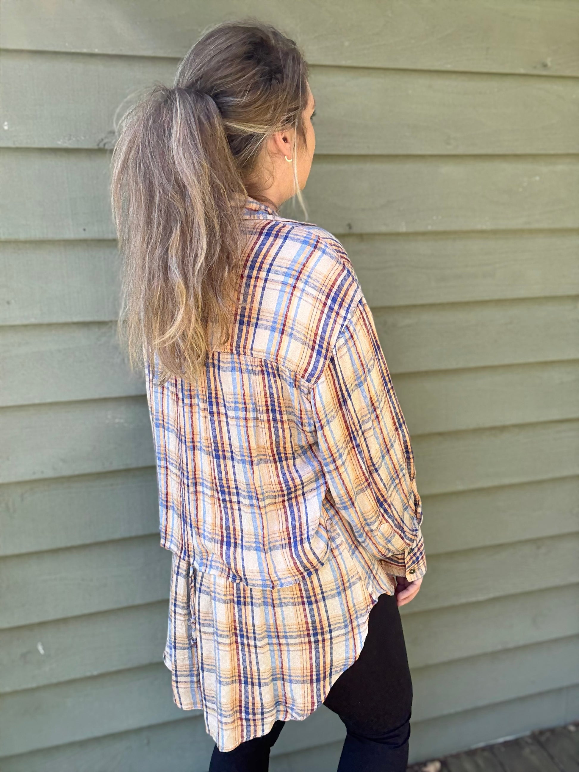 This unique and beautiful, tiered flannel is a must have for your fall wardrobe. It has a colorful, lightweight design, and an adjustable tiered back that is perfect for pairing with leggings and your favorite boots. It is so flattering on all body types and can be dressed up or down.