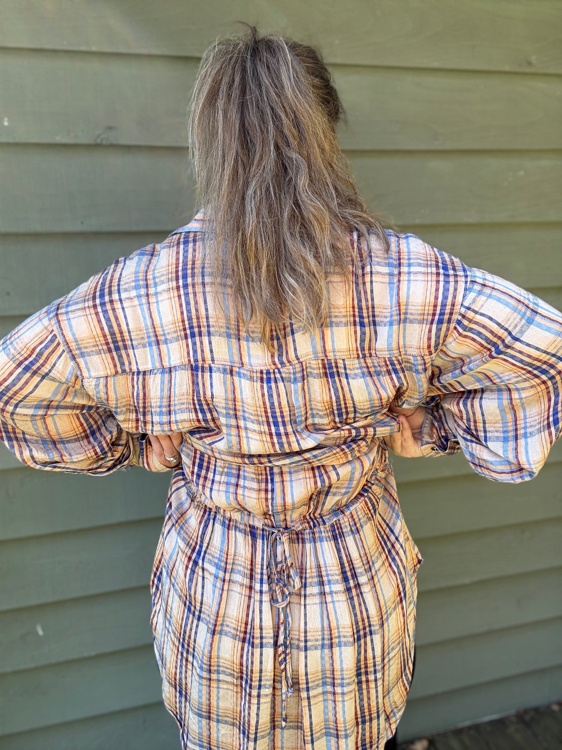 Sizing: This flannel fits true to size but has a relaxed fit and can be singed in or extended with the drawstring at the back. Model is wearing a size M for a more fitted look but her true size is a Large.