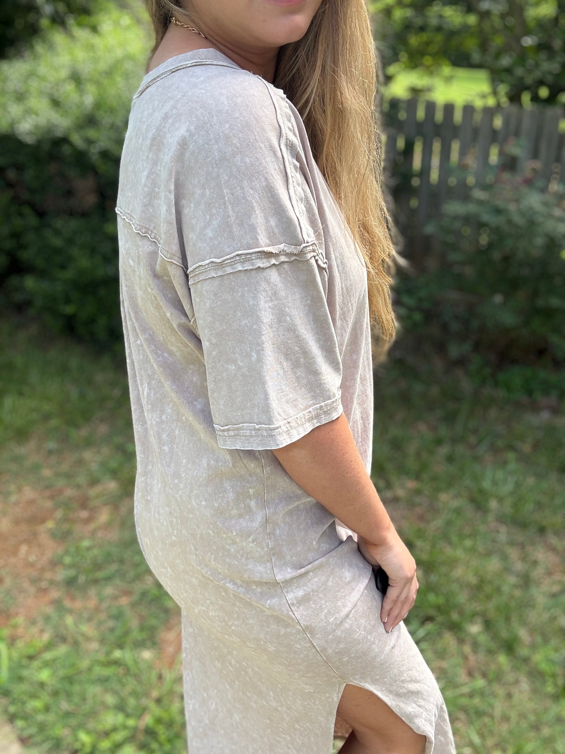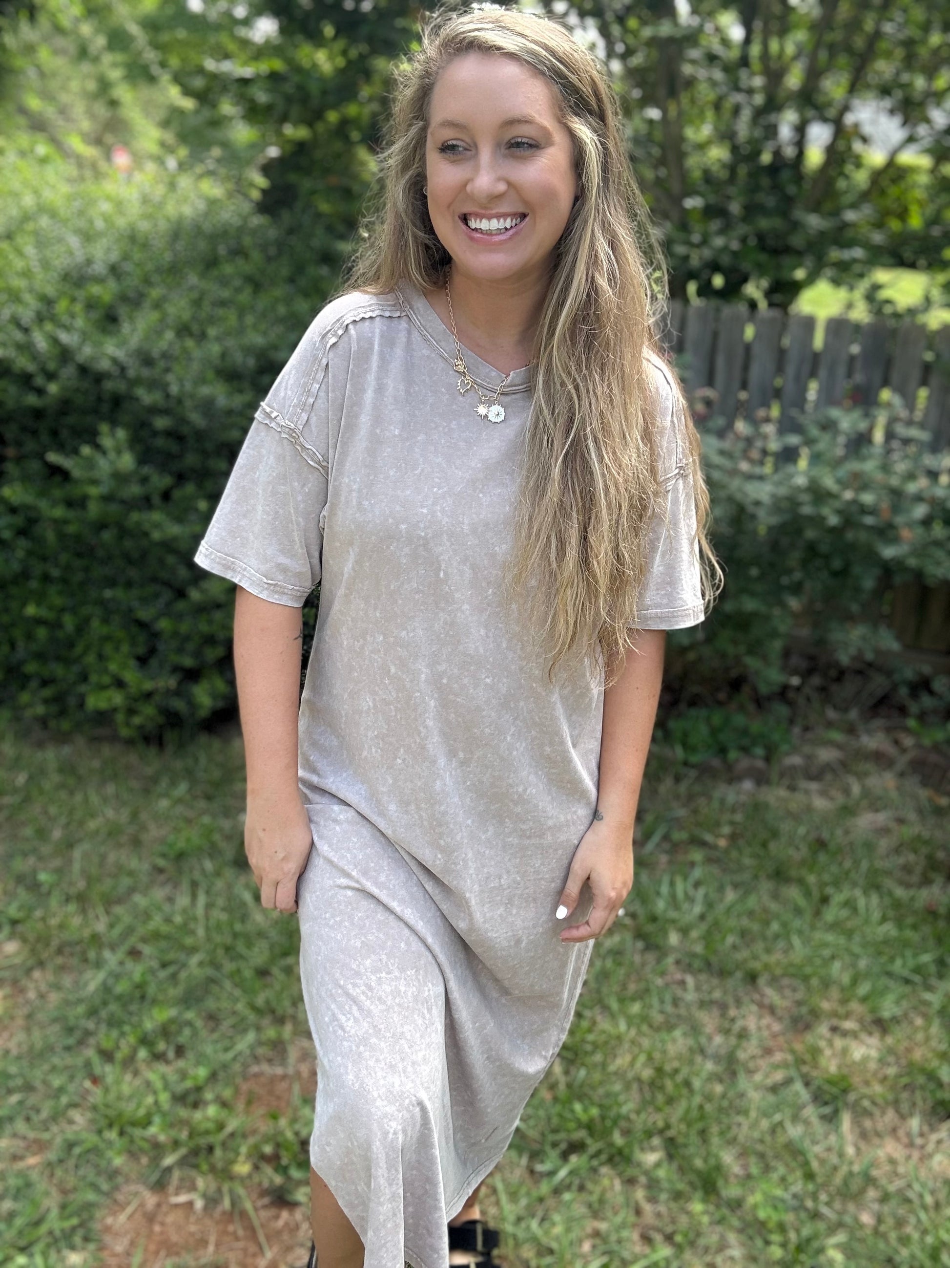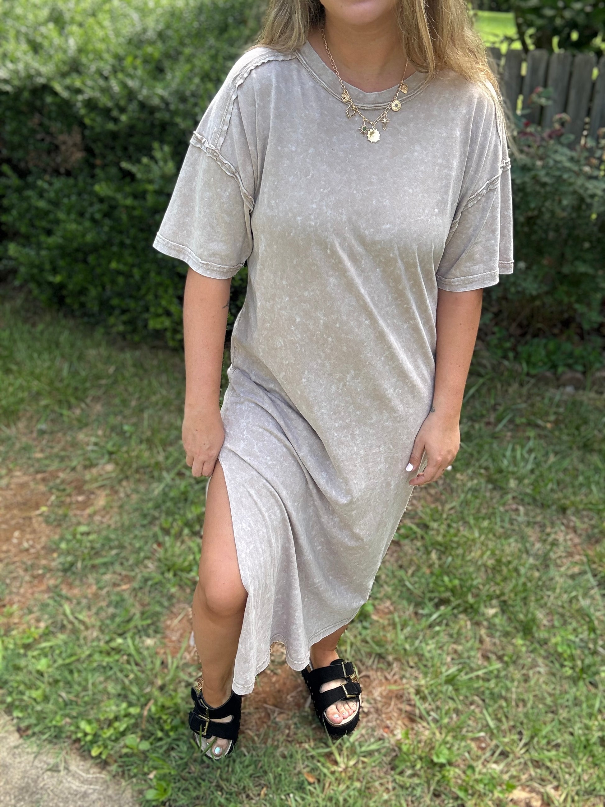 This cute and casual t-shirt dress is the perfect piece to dress up or down. It is lightweight and has a mineral washed design with raw hem detail. It is very comfortable and has an oversized fit.