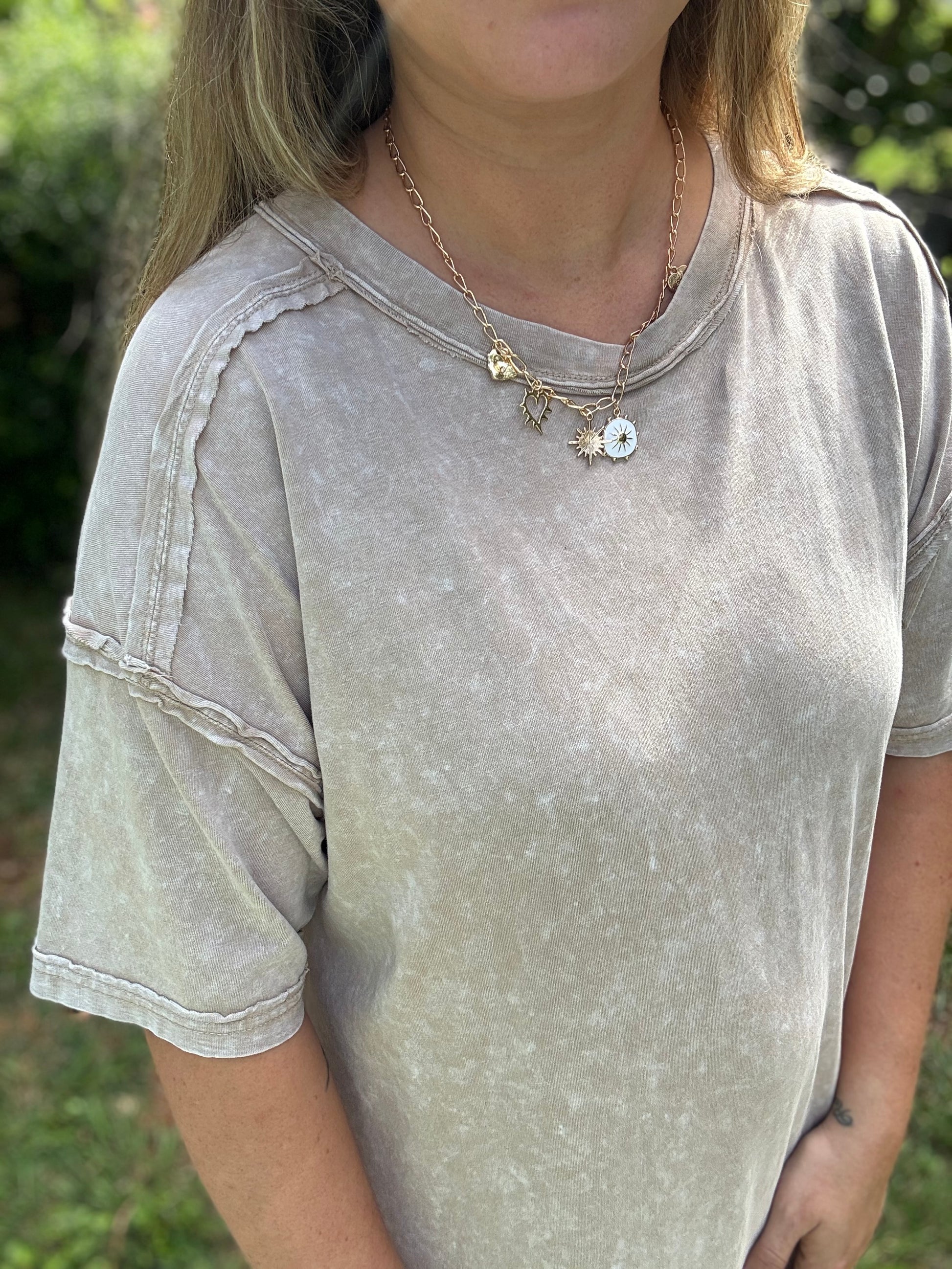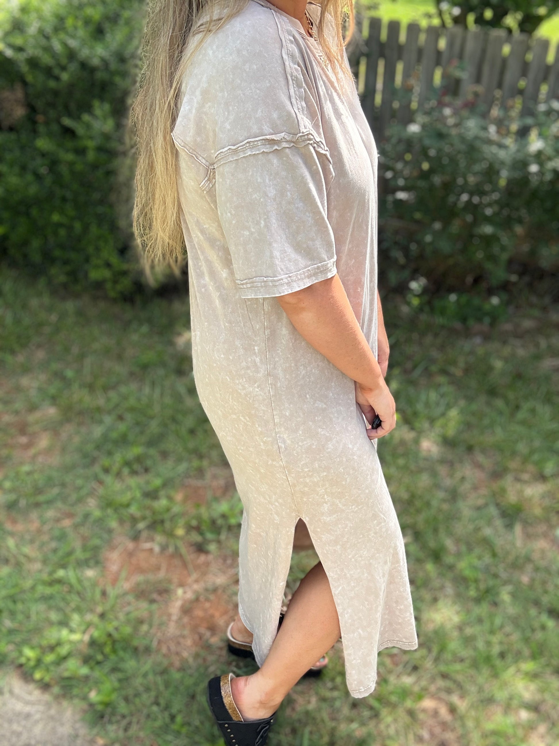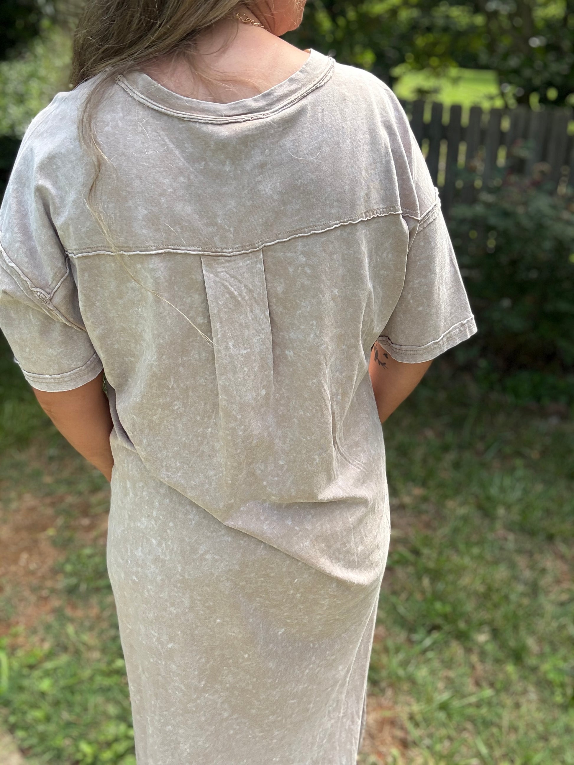 This cute and casual t-shirt dress is the perfect piece to dress up or down. It is lightweight and has a mineral washed design with raw hem detail. It is very comfortable and has an oversized fit.