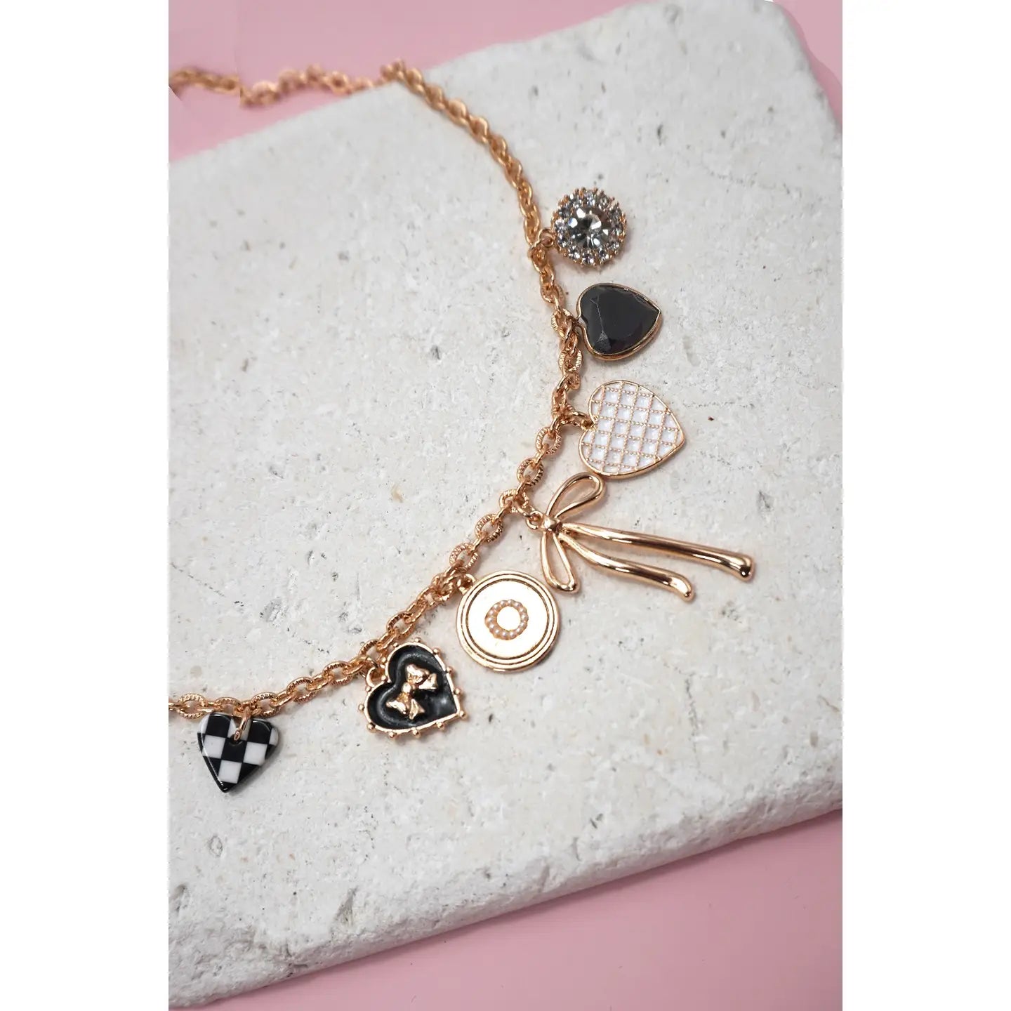 The Checkmate Charm Necklace features a delightful mix of charms, including a Bow, Checker Heart, Rhinestone and heart charms, all beautifully strung on a sleek chain. The checker pattern brings a trendy, bold vibe, the heart represents love, and the rhinestone charm adds a bit of glamour and shine.