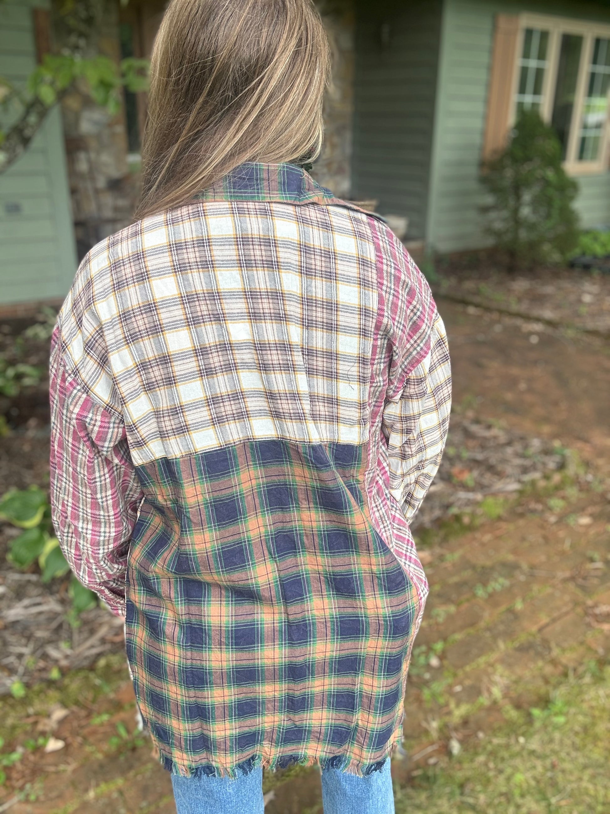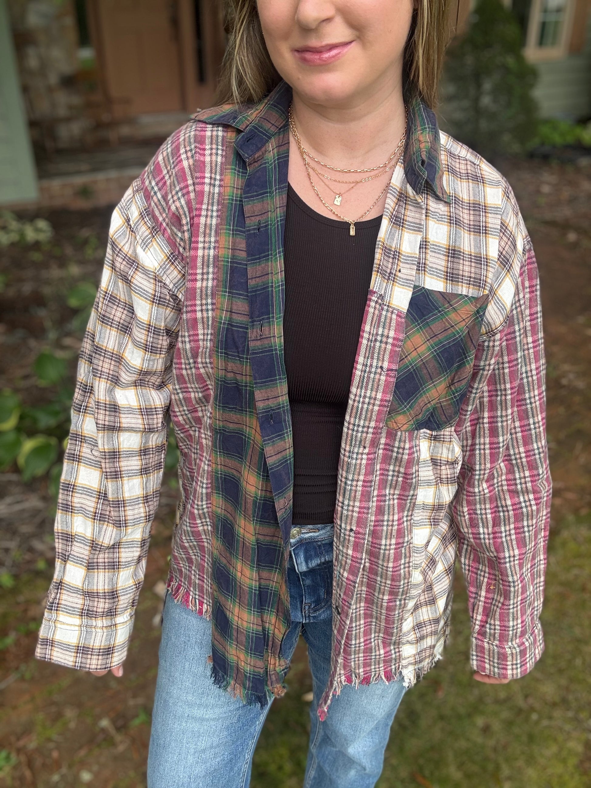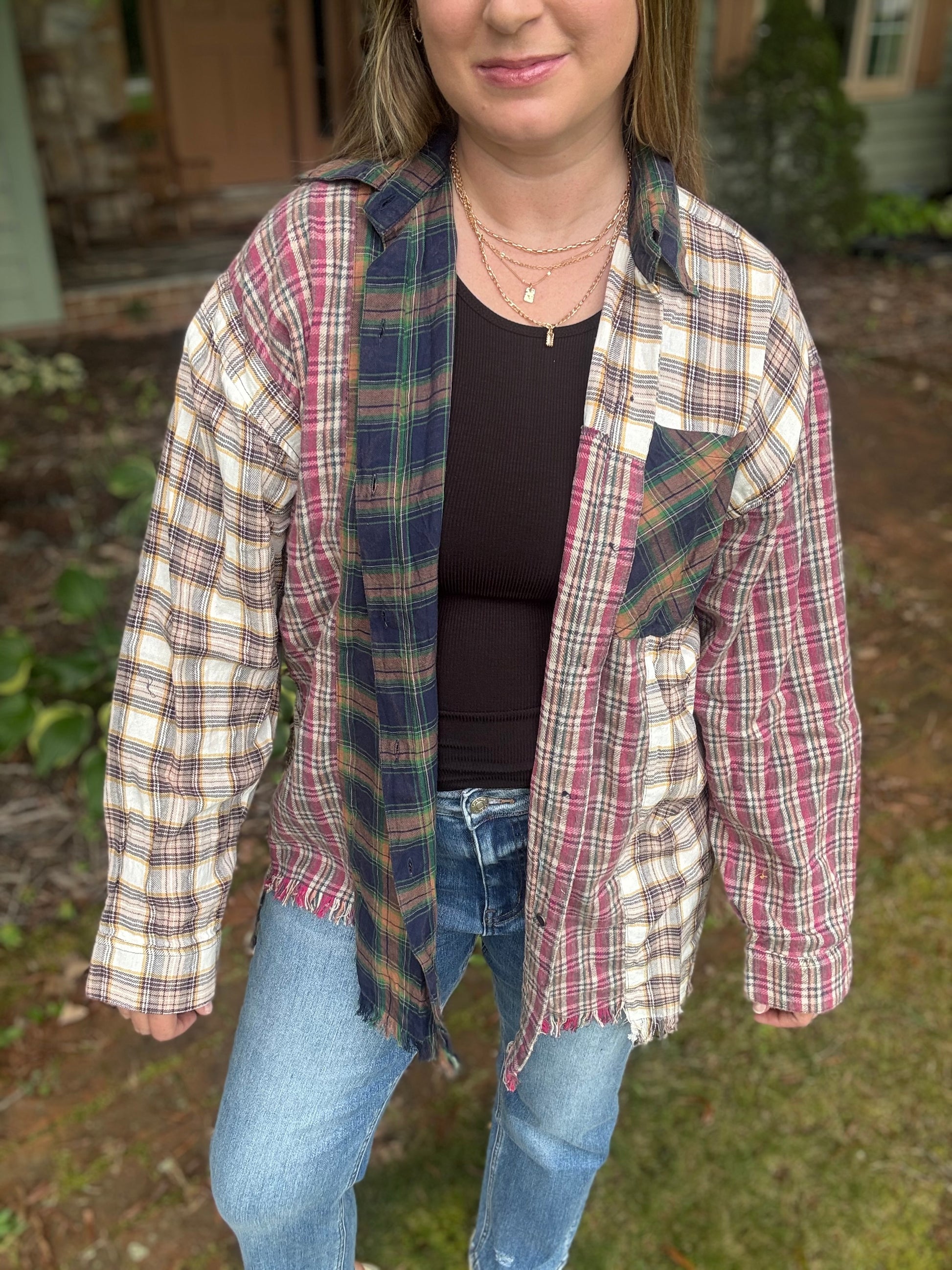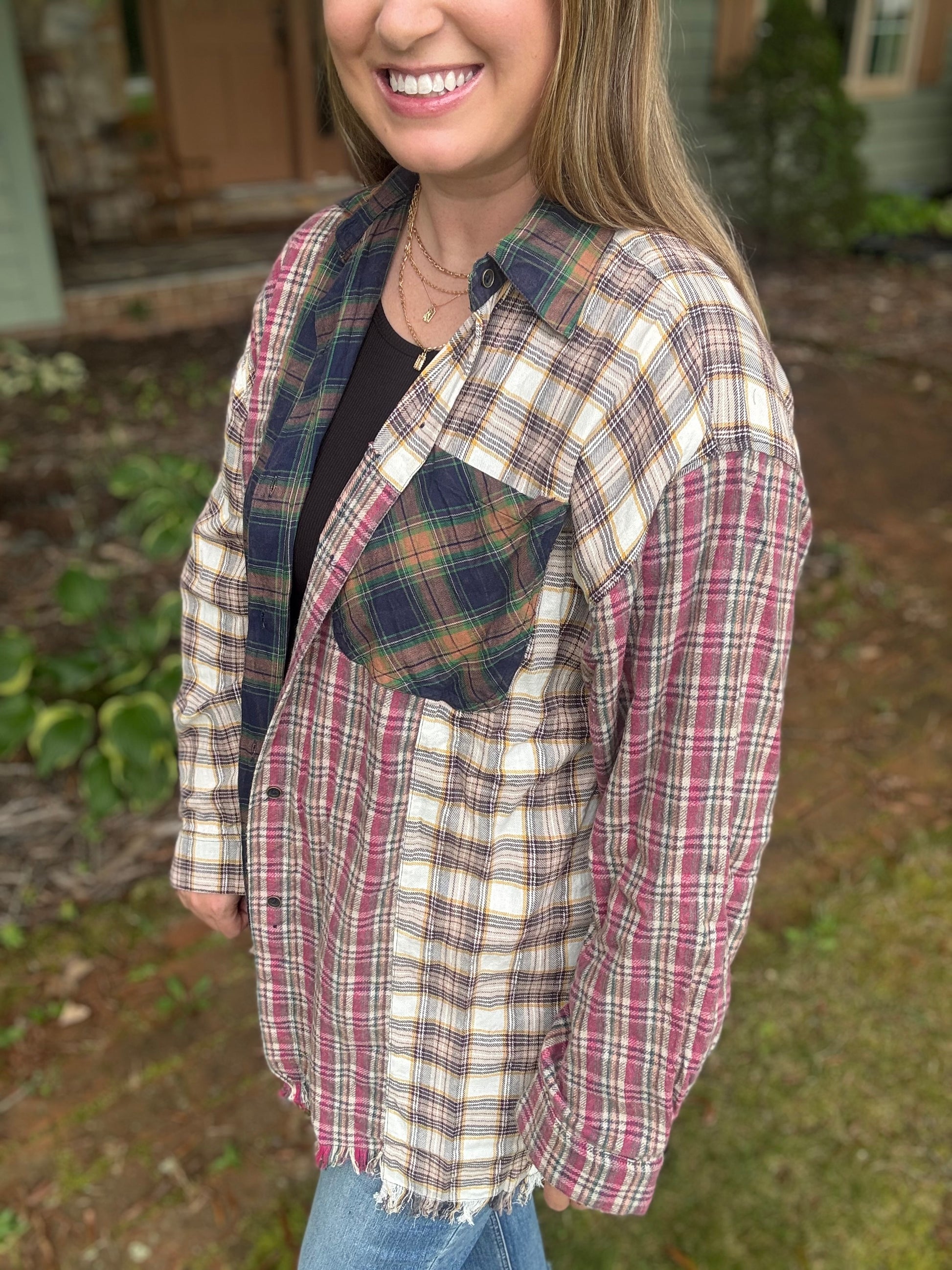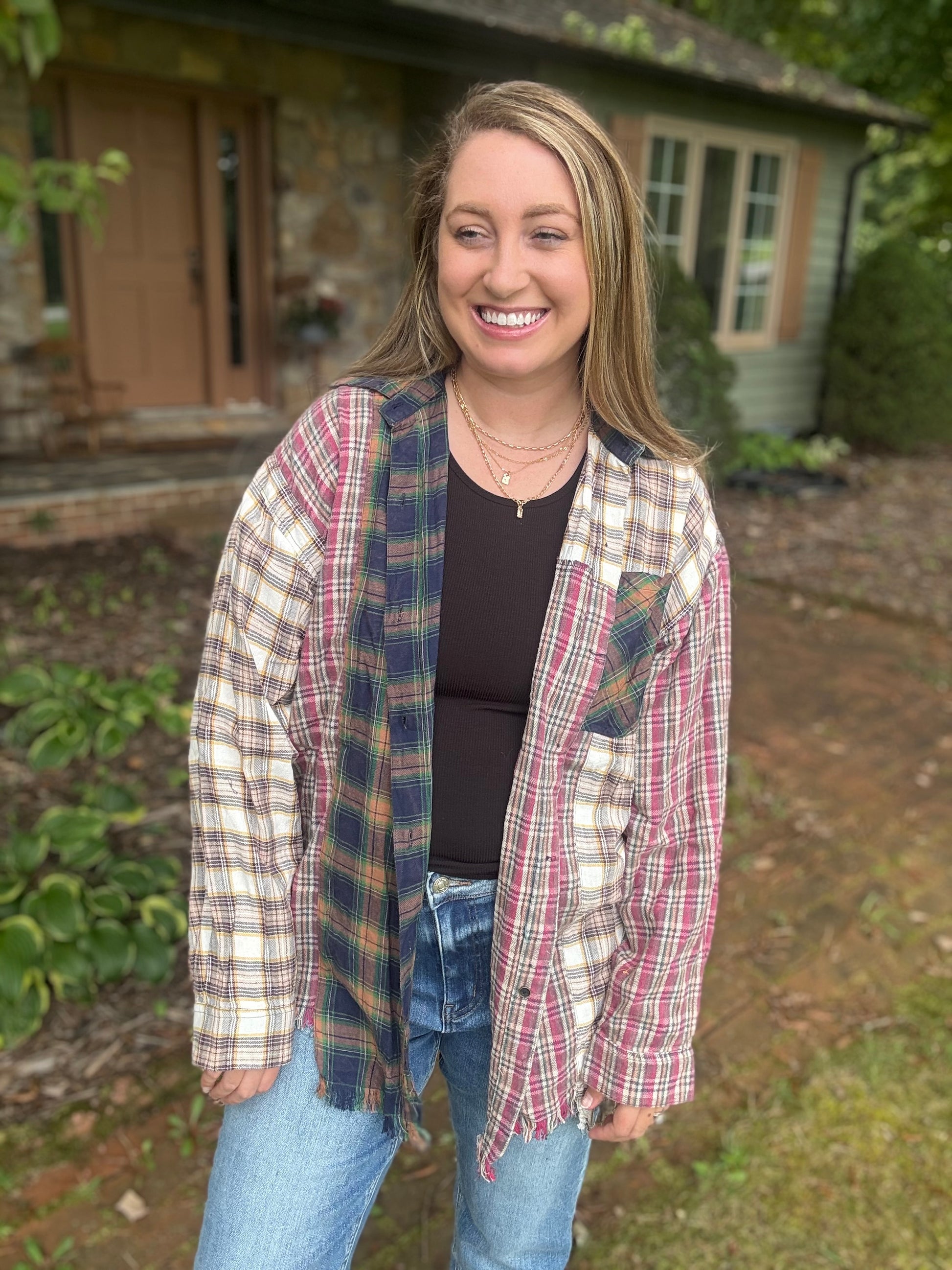 This adorable flannel is channeling our love for Gilmore girls and is giving all the fall vibes. It has a mixed media plaid patchwork design, is oversized (wearing a med), has a great long length and has a fringe trim. It is the cutest piece to pair with jeans, leggings, shorts or even bikers and can be dressed up or down. We have it paired with our Jenny jeans and new padded ribbed layering tank in black.