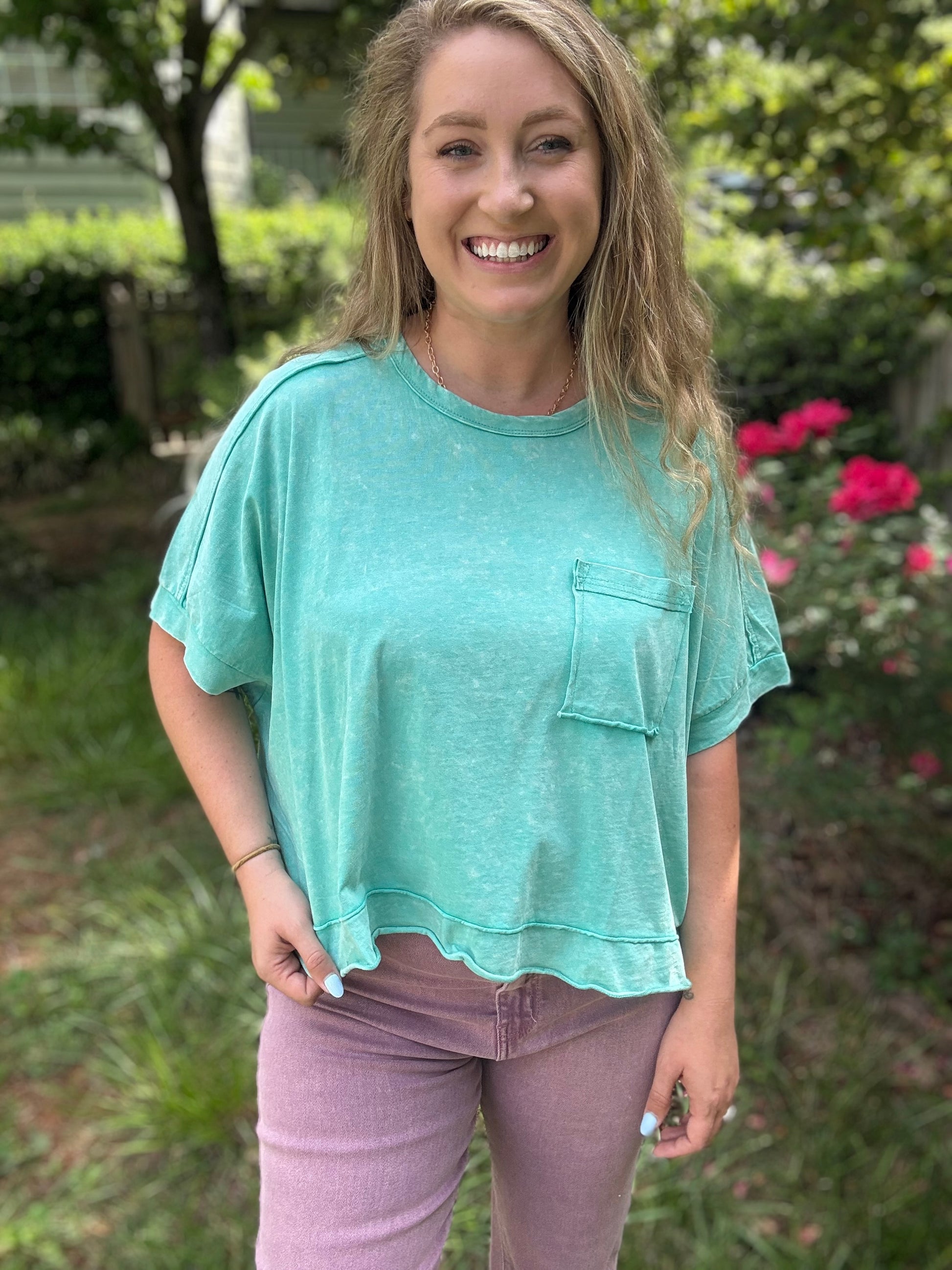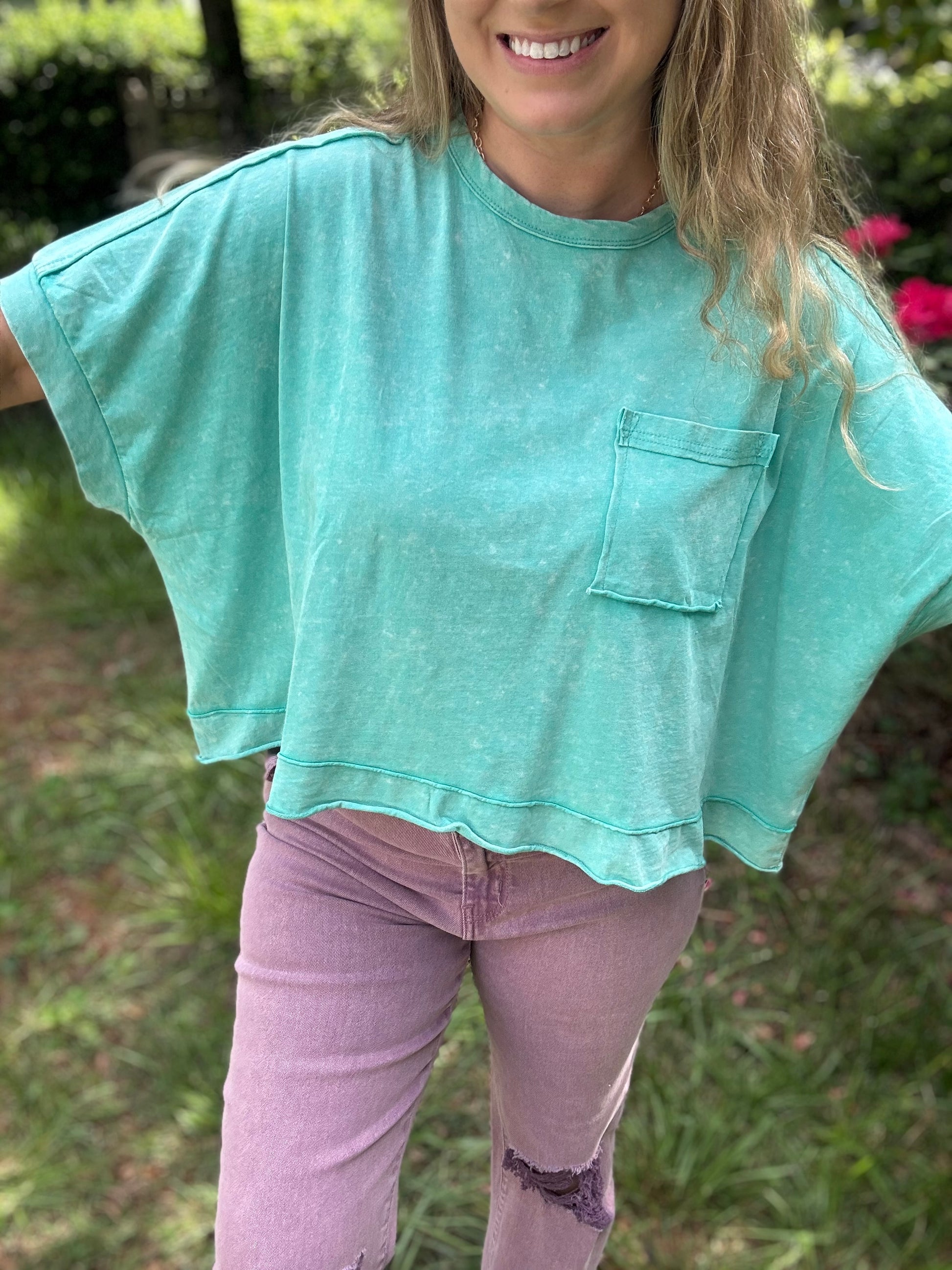 This stunning and lightweight pocket tee is sure to be your new favorite top. It is slightly cropped, has a raw hem detail and is oversized. It comes in a bright mineral washed Kelly green color. It’s a great piece to pair with your favorite jeans or shorts or even dress down with leggings or some bikers.