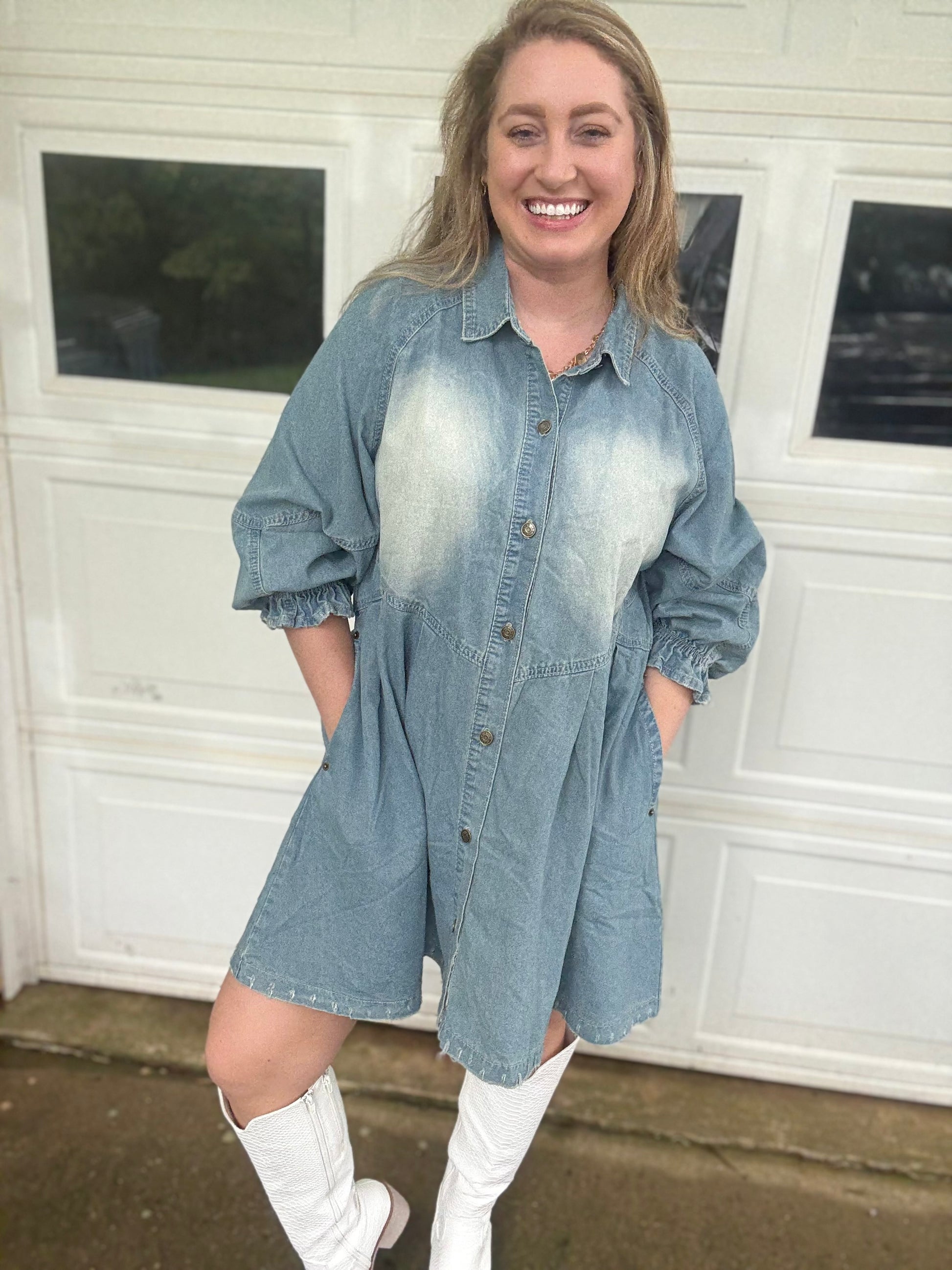 Our best selling Daisy Denim is back and in a new wash. This adorable dress is the perfect transition to fall piece. It features a lightweight denim design with cuffed ruffle sleeves and a flowy bodice with pockets. It is a beautiful piece to dress up with your favorite boots or dress down with sneakers.