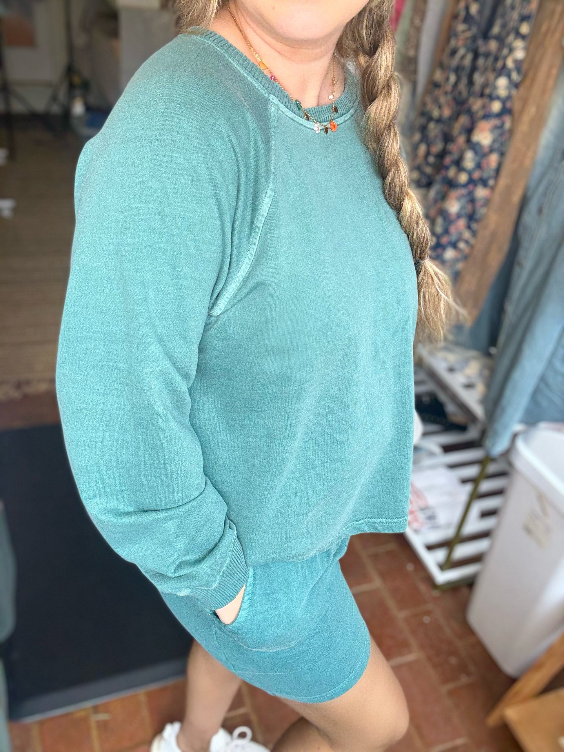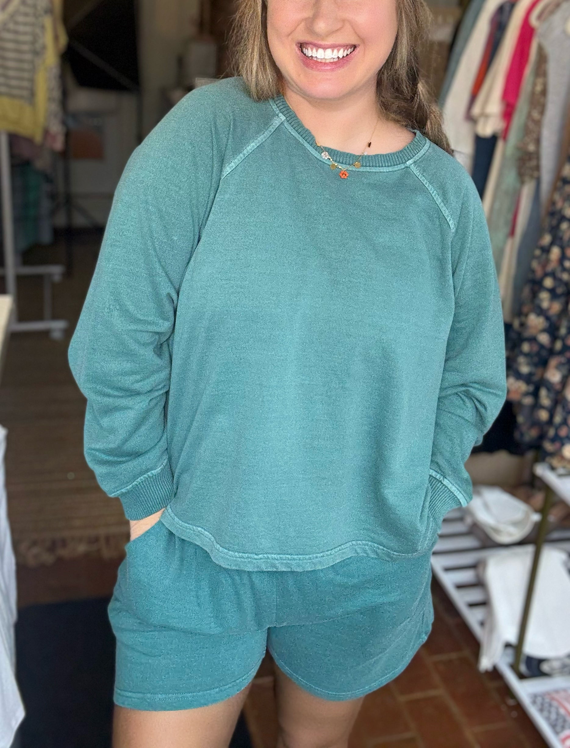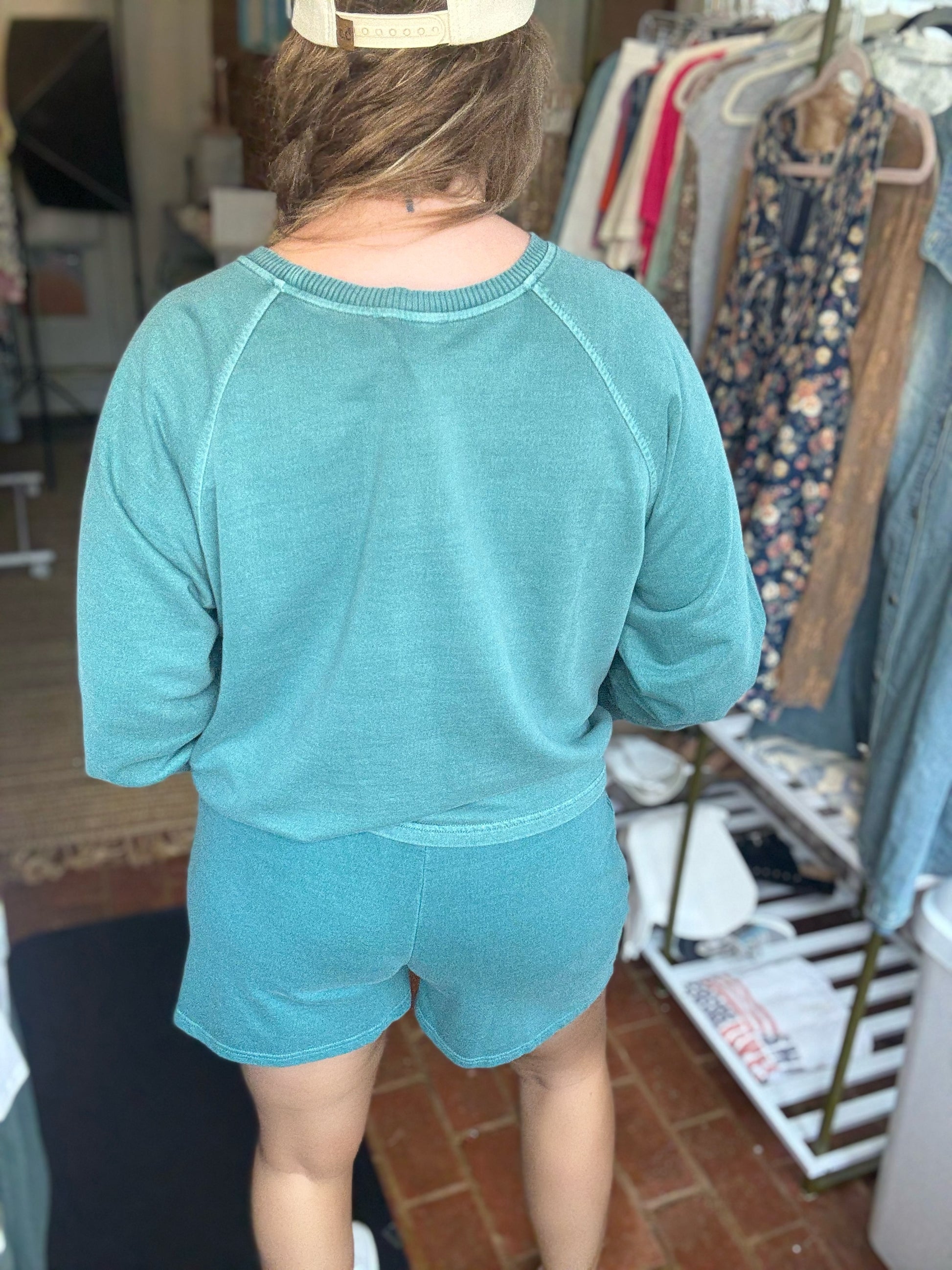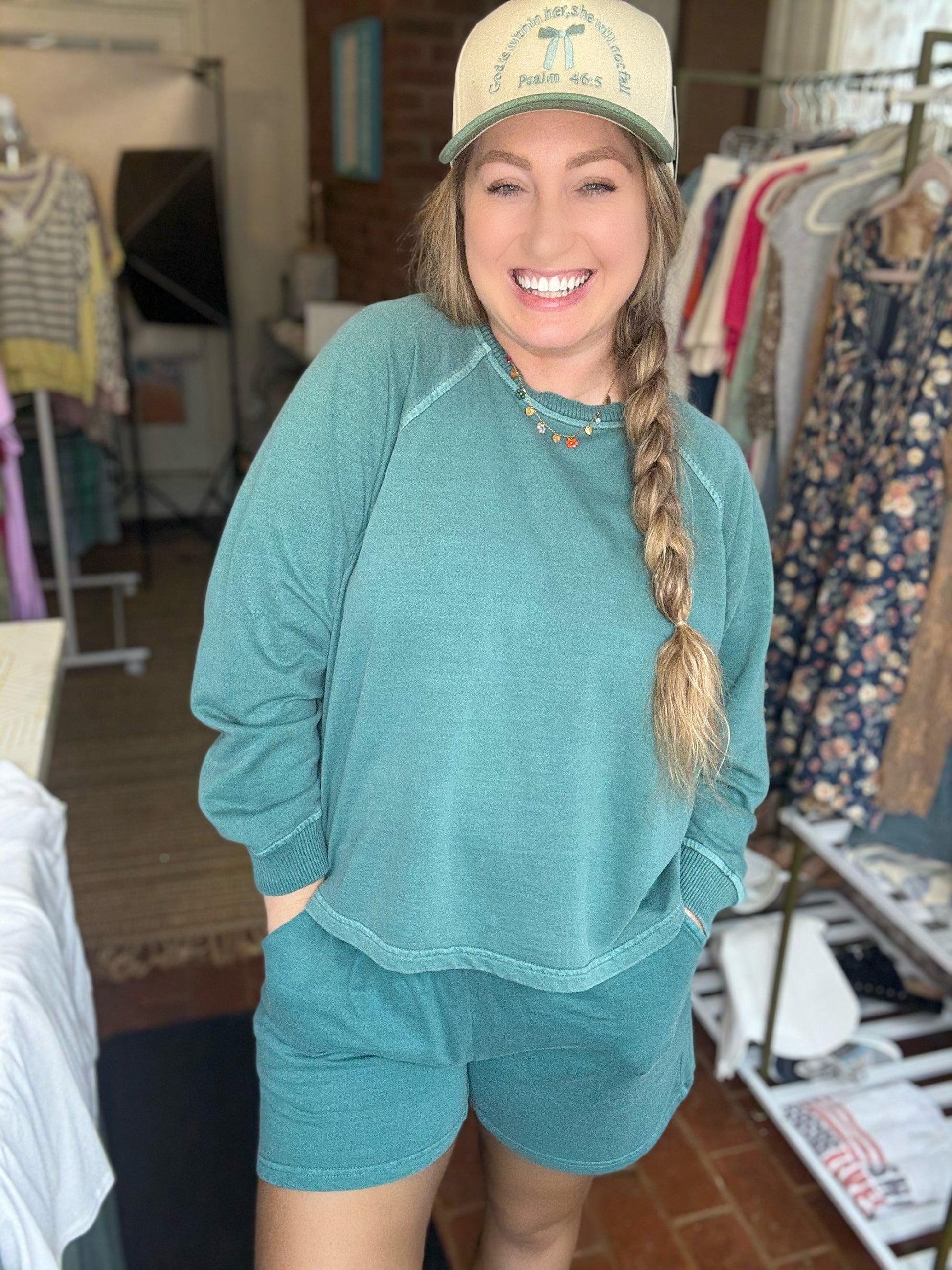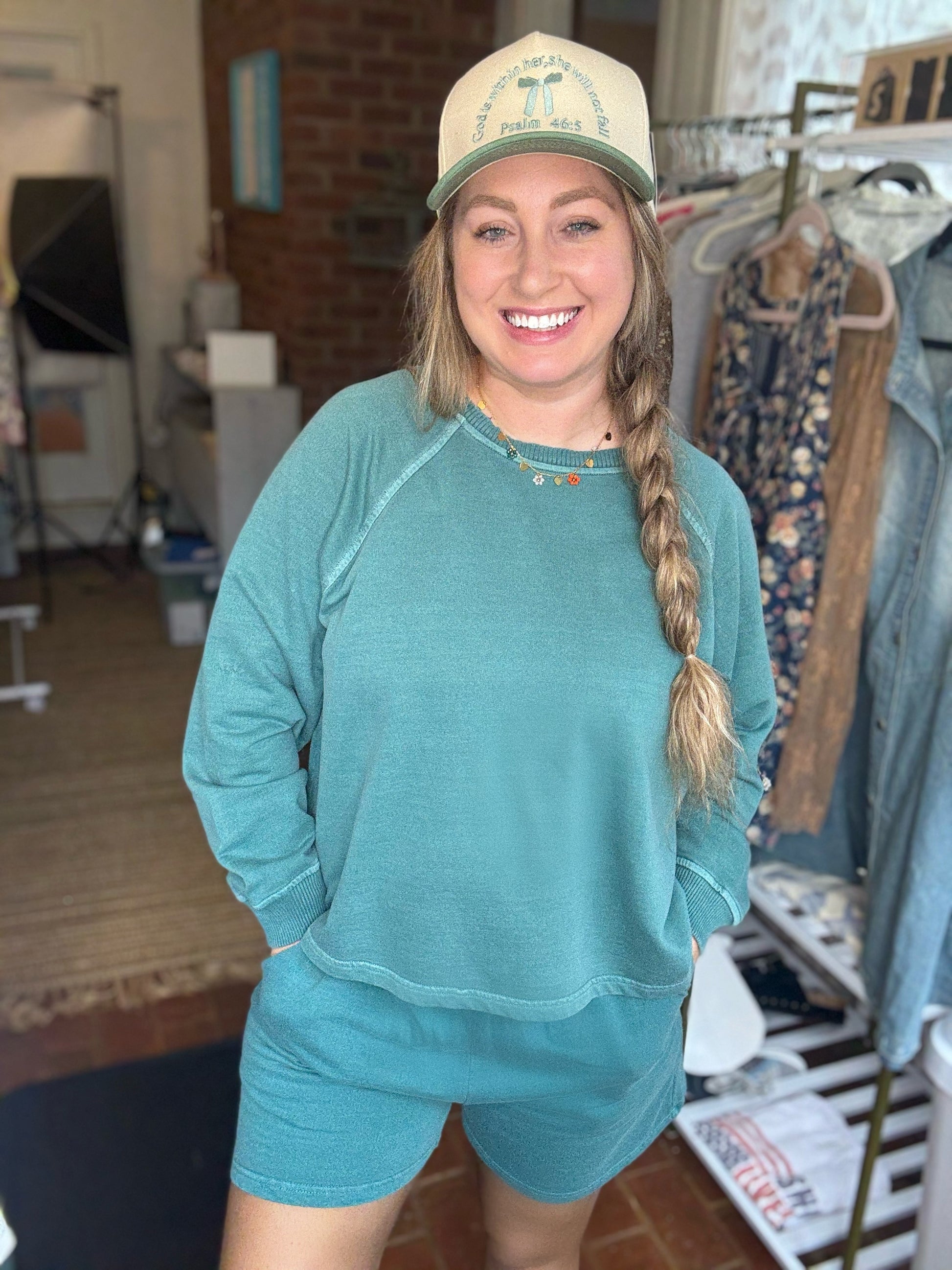This adorable set is so comfortable and comes in a stunning teal color. It has a lightweight terry cotton pullover top with matching shorts with pockets. It pairs perfectly with our new Psalm trucker. This set comes with both the top and bottom.