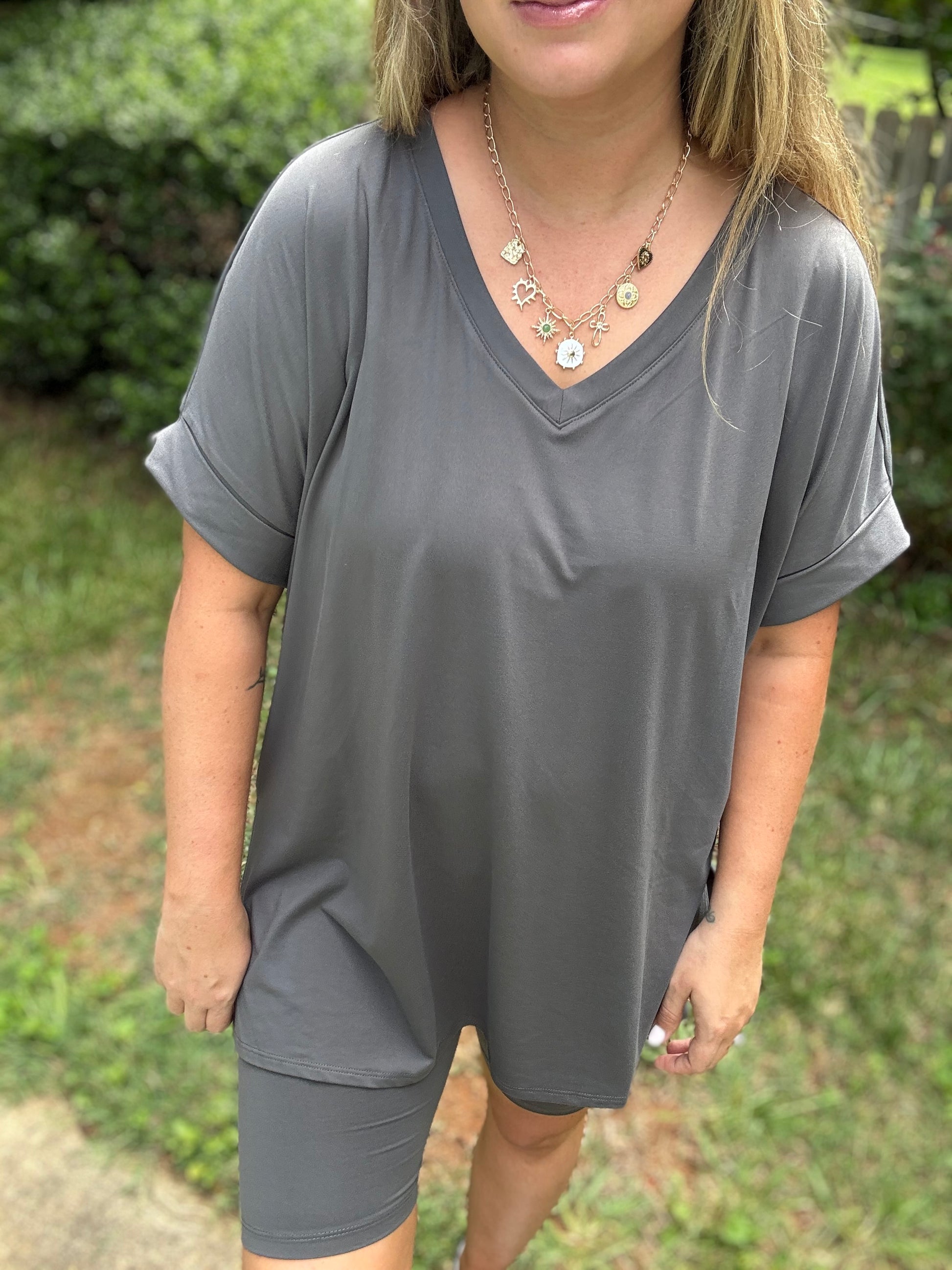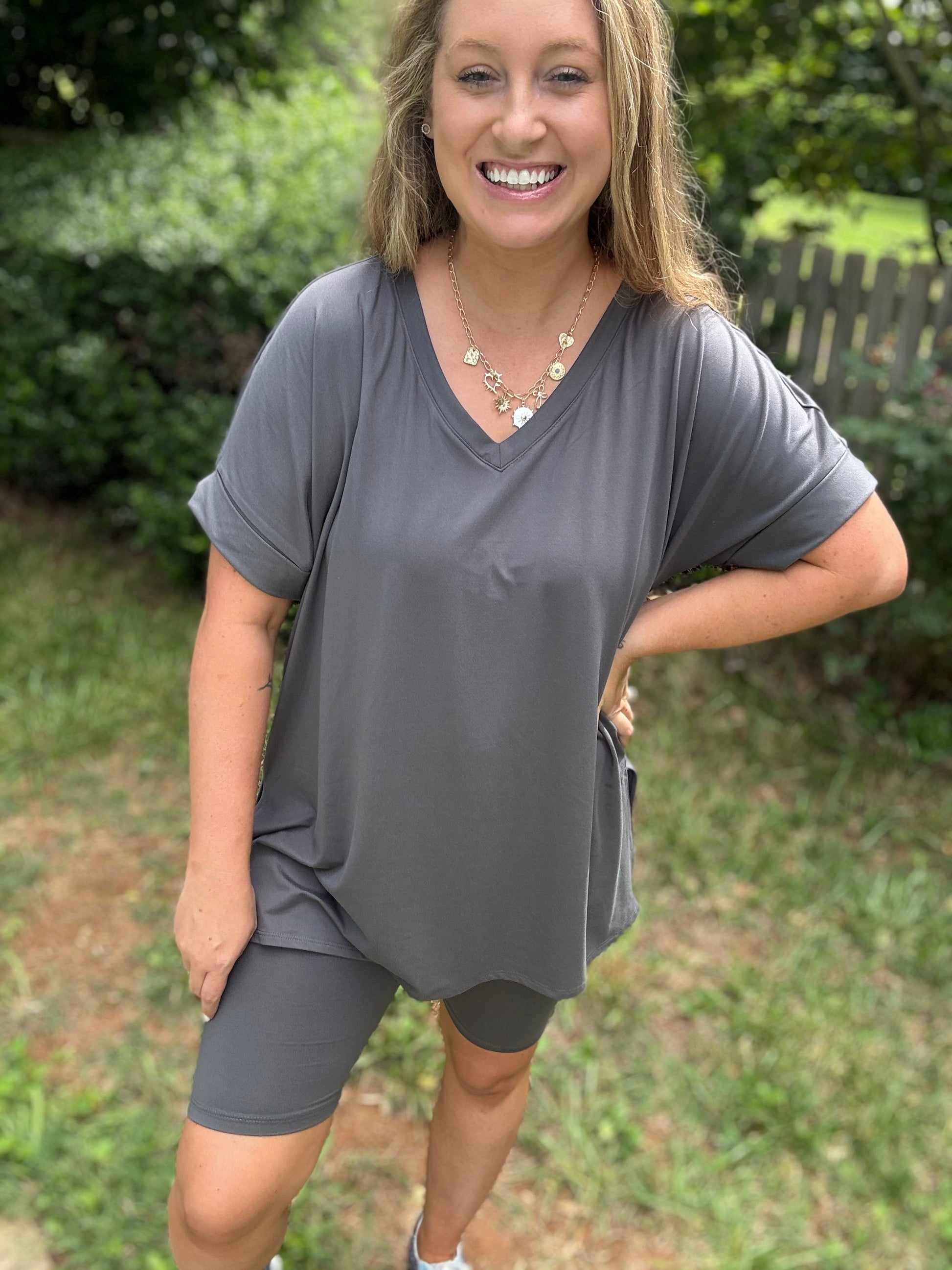 EVERYDAY ESSENTIAL (V-NECK) - BIKER SHORT SET/ Charcoal