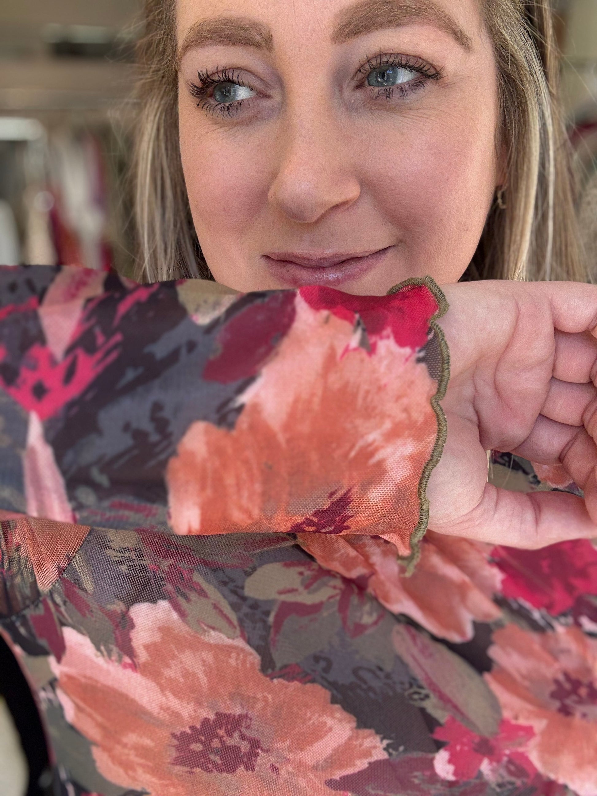 Sizing: This piece has a true to size fit but is stretchy and breathable. Model is wearing a size Medium which is her true size.