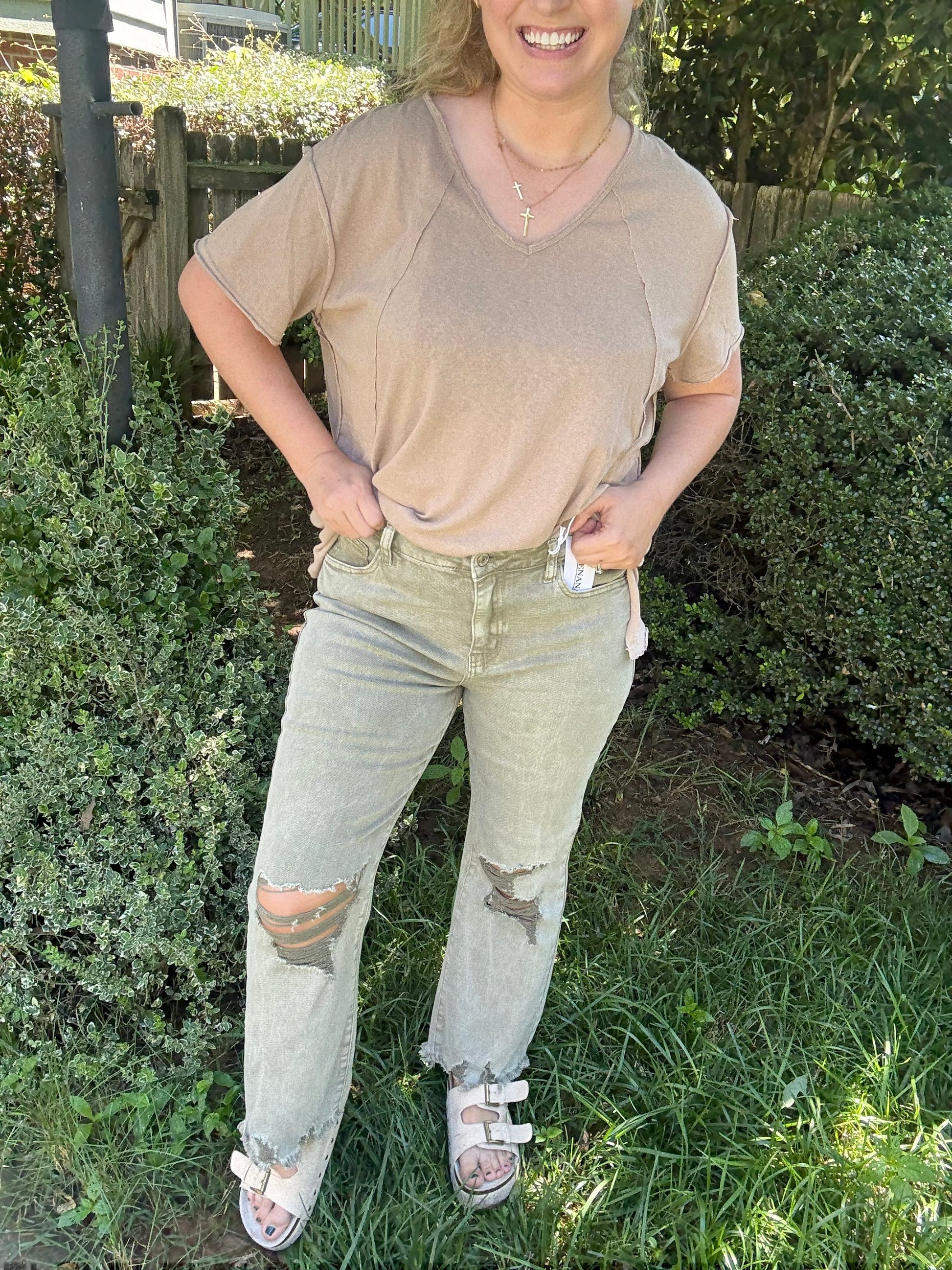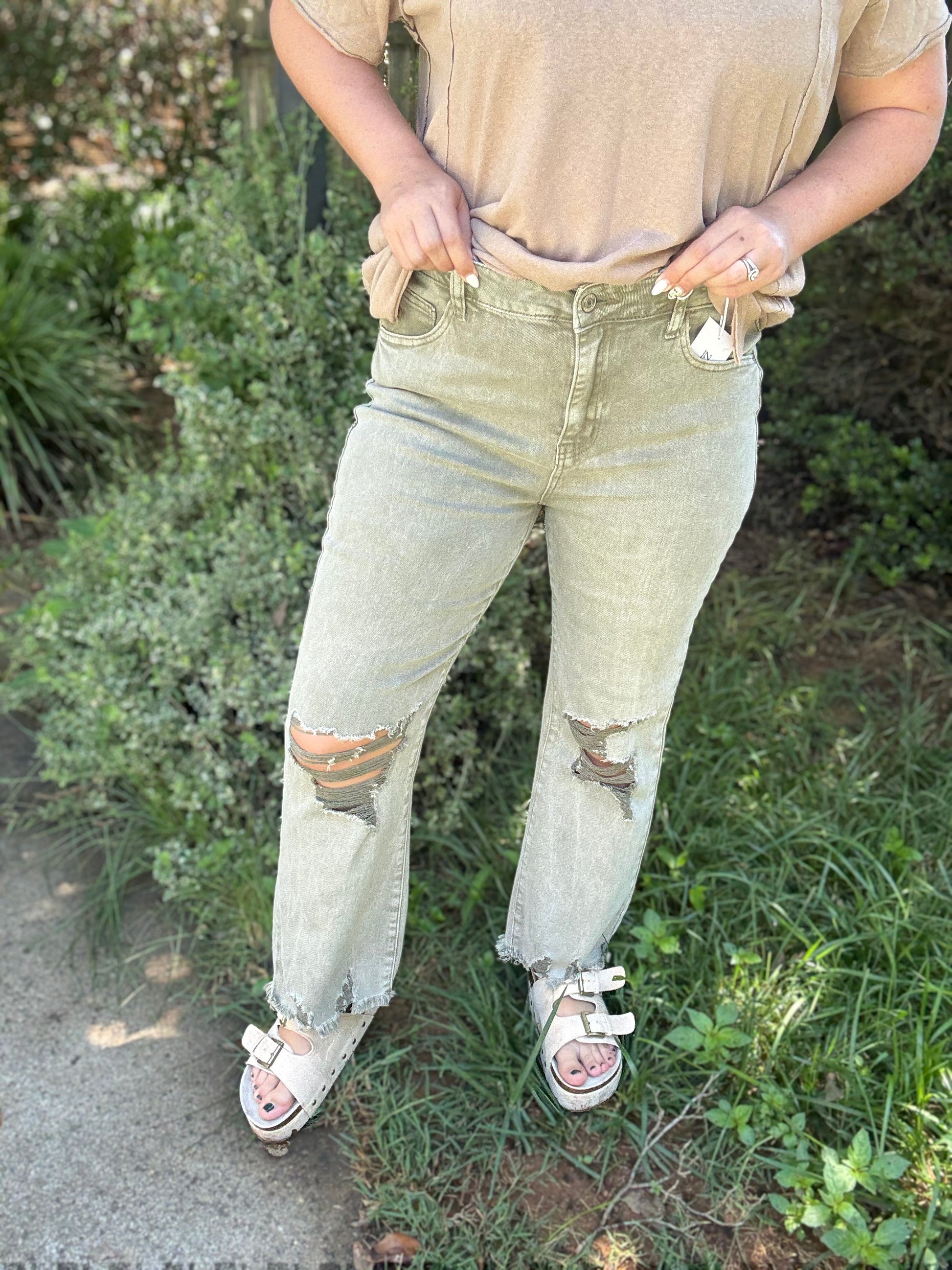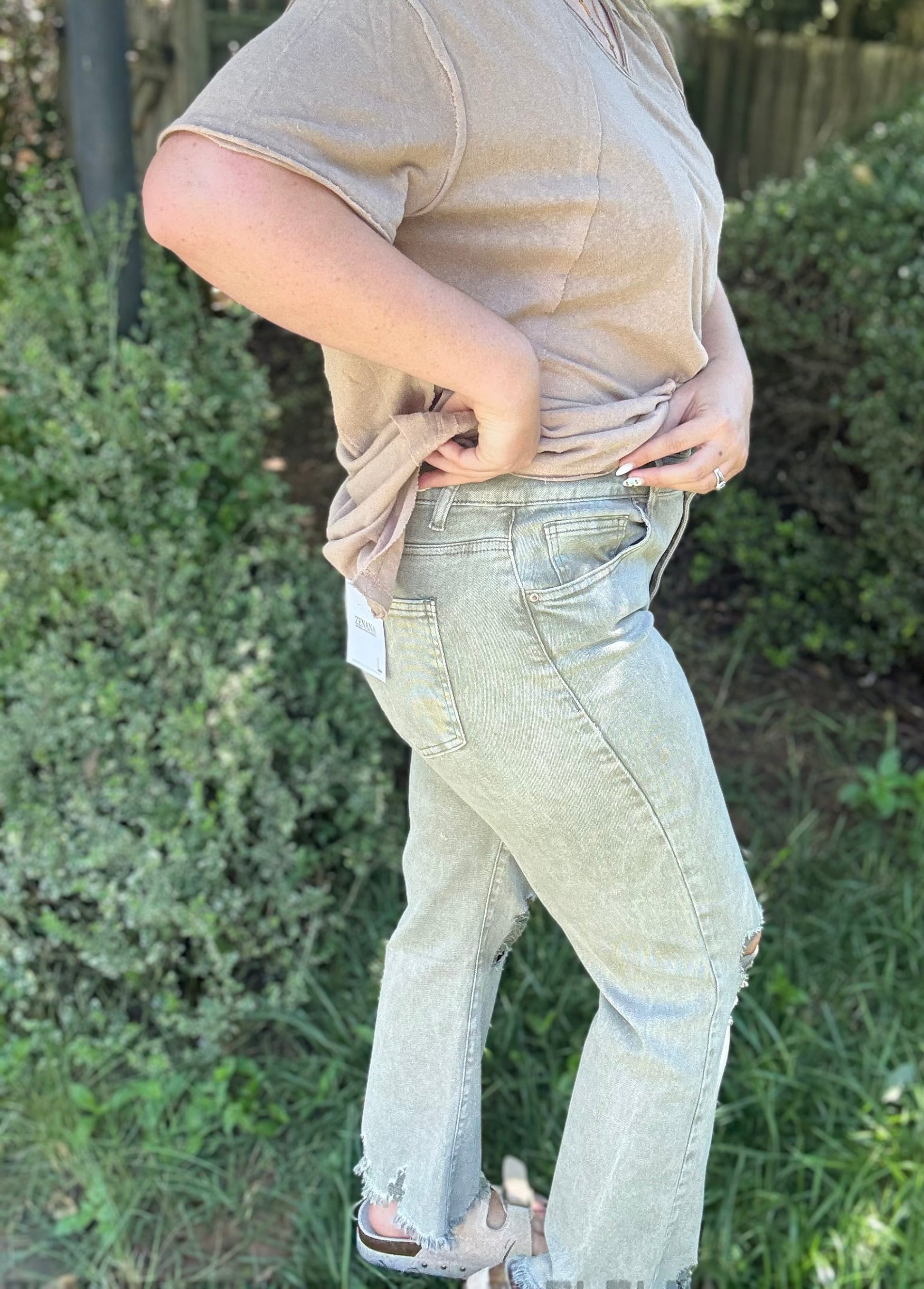 These sage jeans are sure to make a statement and will elevate any outfit. It is made from a stretchy denim fabric with a distressing detail and are high waisted. These have a true to size but stretchy fit. We recommend sticking to your true size. We know these will go fast, make sure to check out our other Fray & Lavender Denim as well.