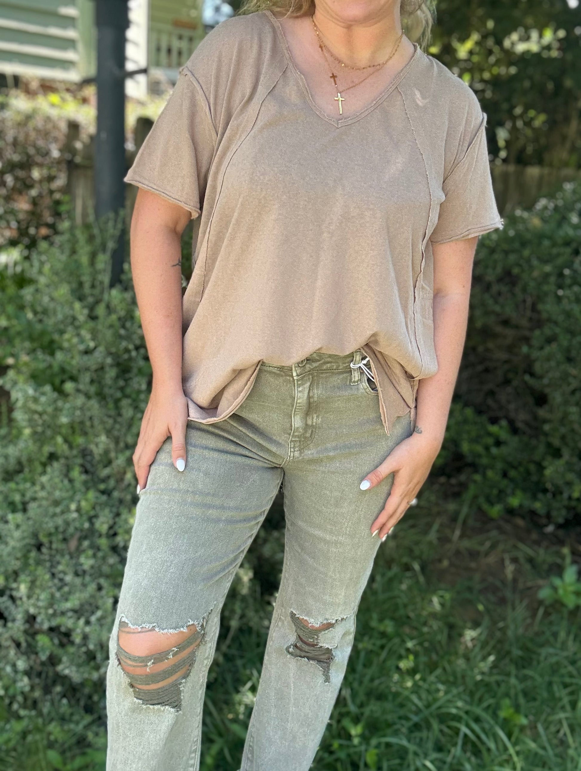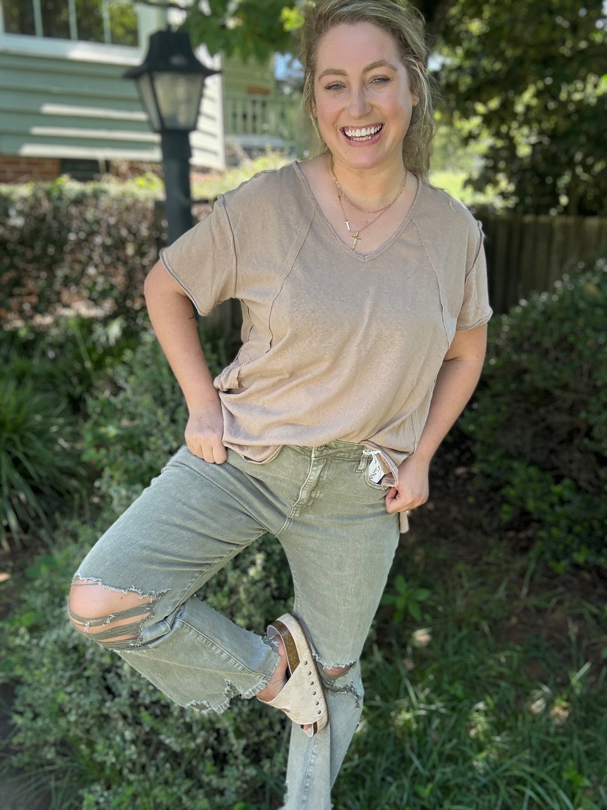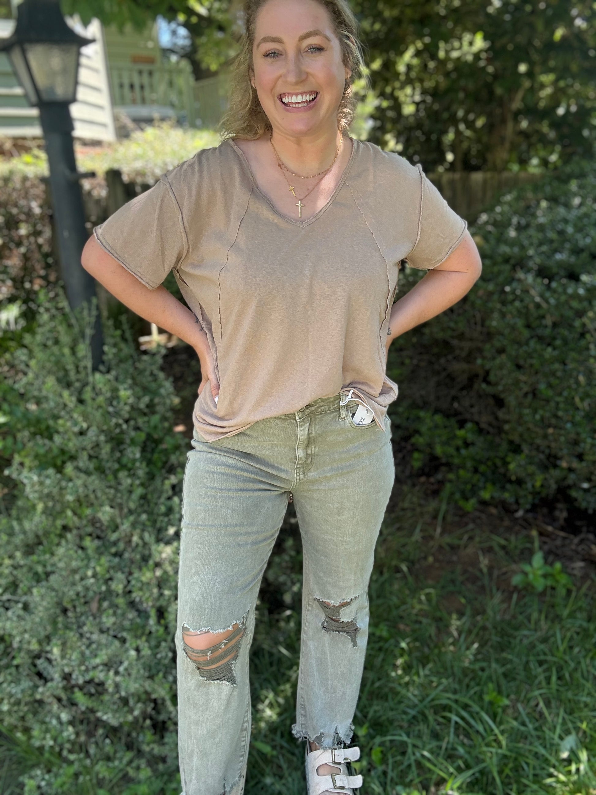 These sage jeans are sure to make a statement and will elevate any outfit. It is made from a stretchy denim fabric with a distressing detail and are high waisted. These have a true to size but stretchy fit. We recommend sticking to your true size. We know these will go fast, make sure to check out our other Fray & Lavender Denim as well.