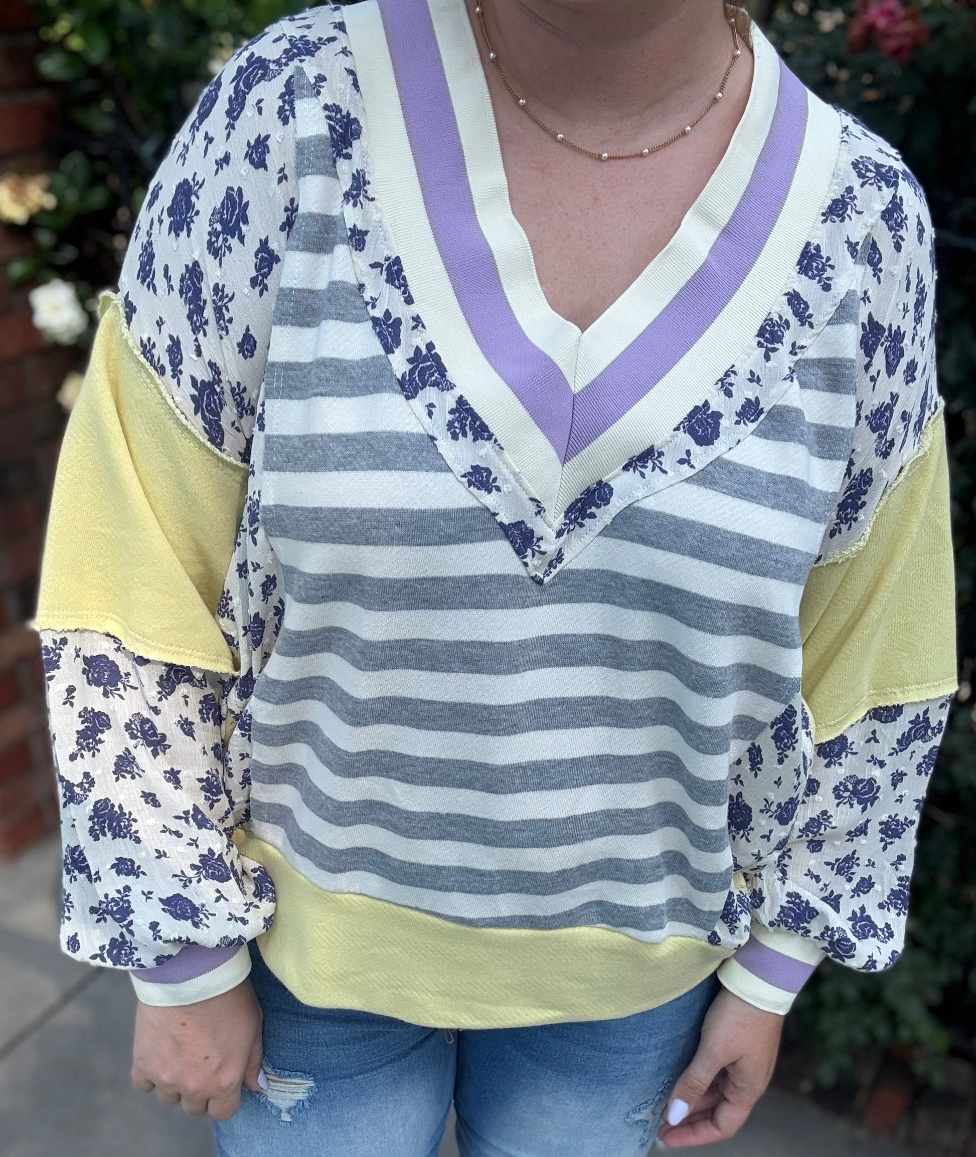 This summer pullover combines a charming solid and floral contrast with a V-neck trimmed in striped elastic, plus long drop-shoulder sleeves for a relaxed vibe. Made by Bucketlist, it guarantees top-notch quality. The French terry fabric blends perfectly with a breezy, scarf-like floral material, making it ideal for warm days. Pair it with our Coastal White Shorts for an effortlessly cute summer look!