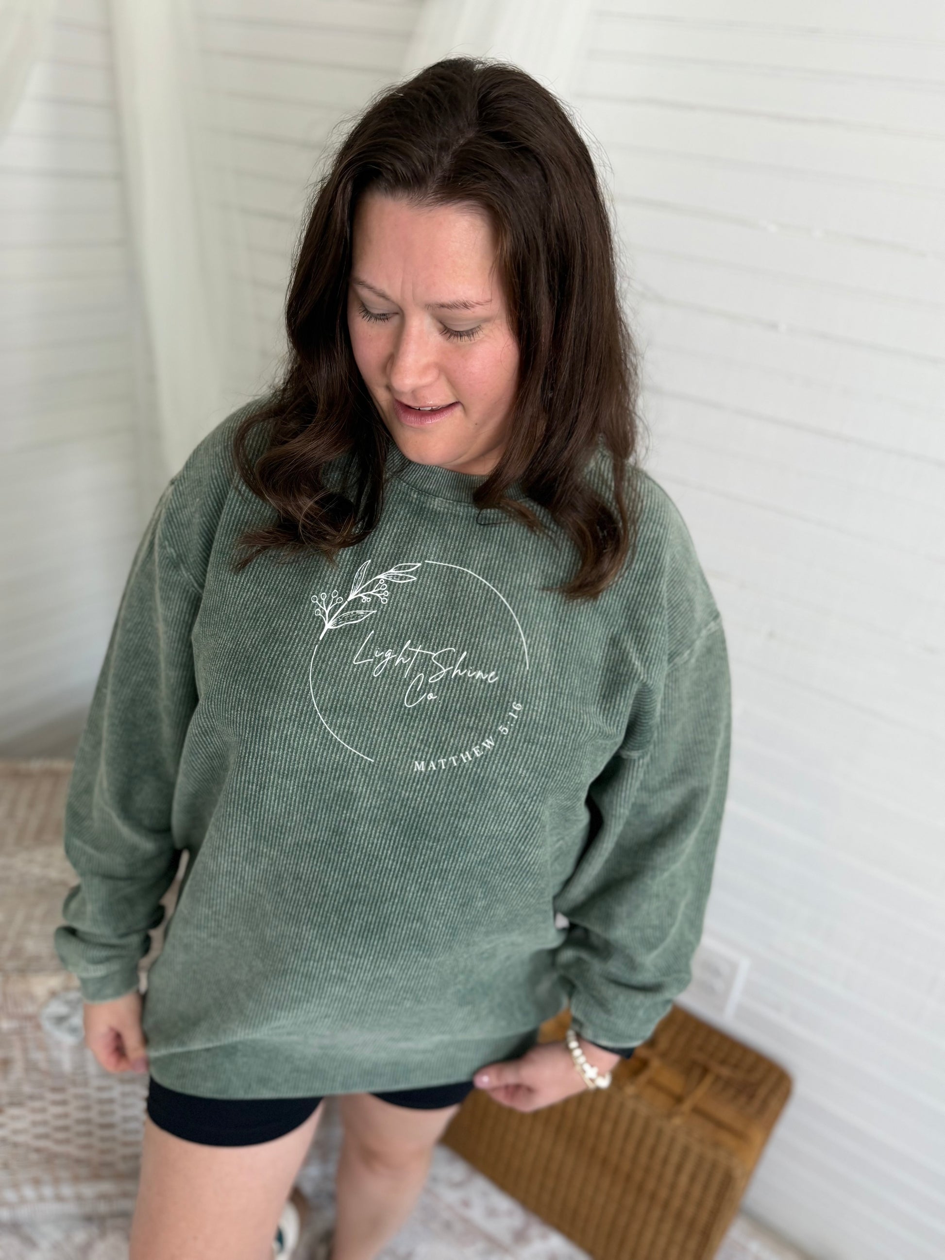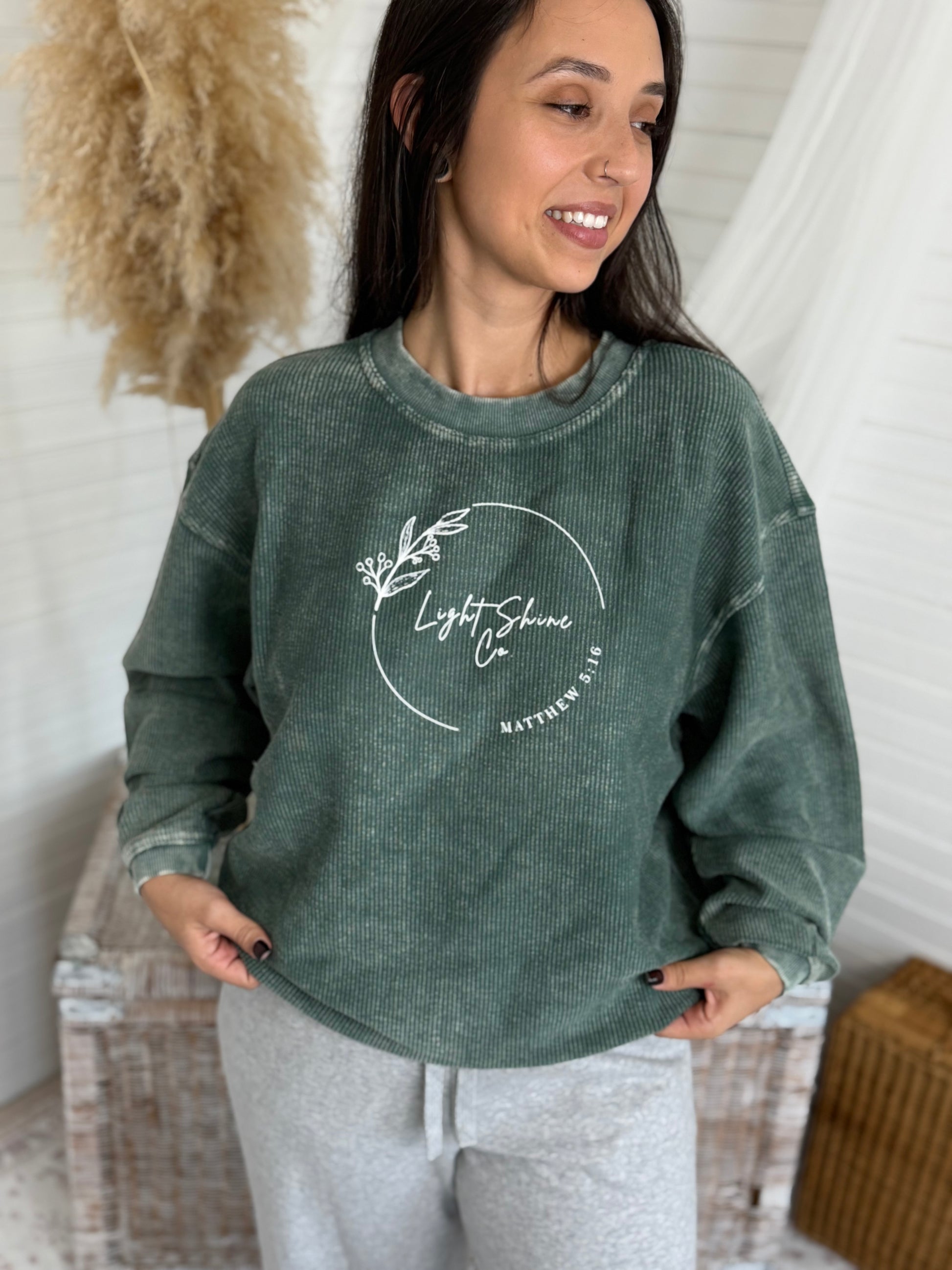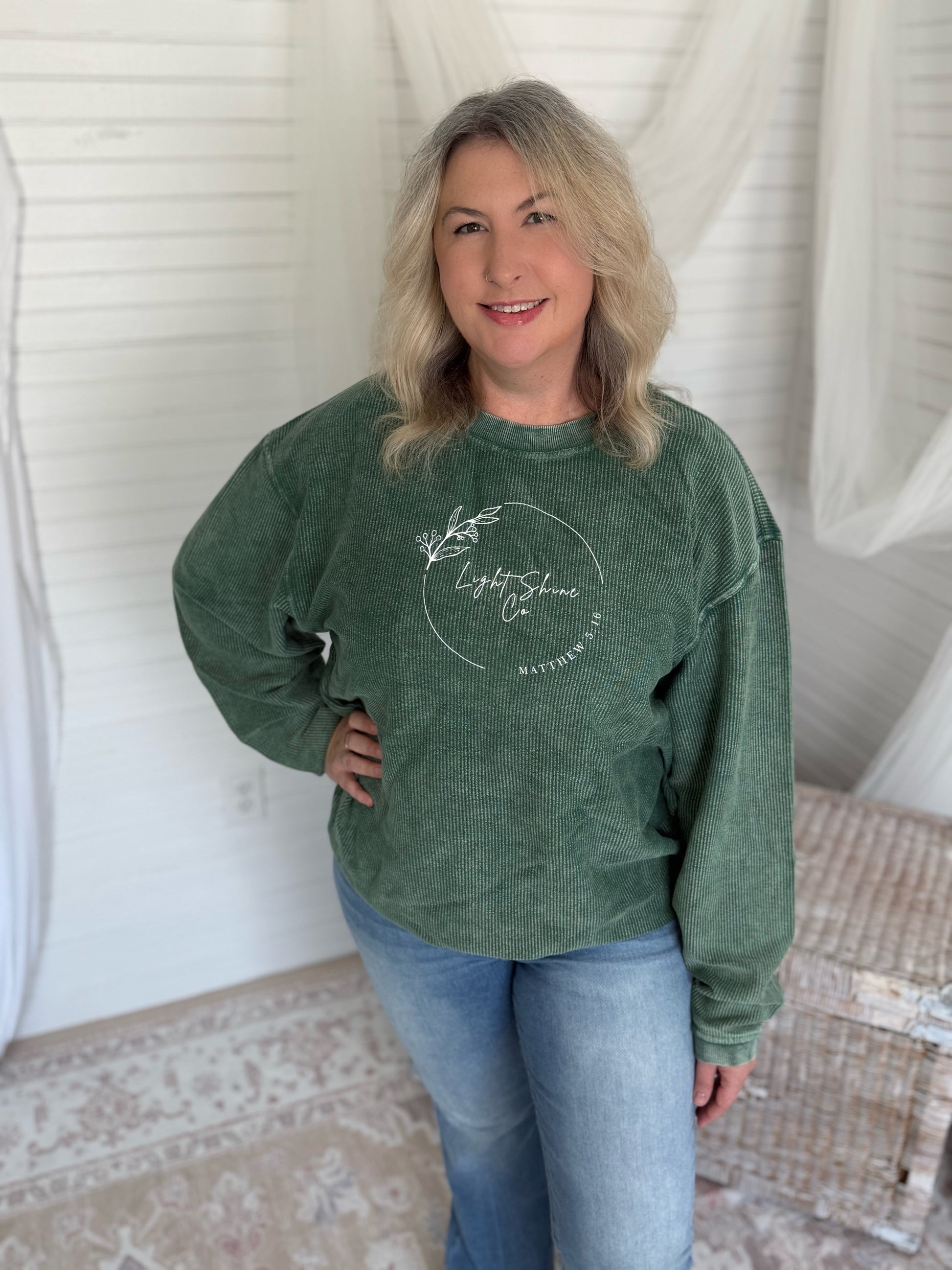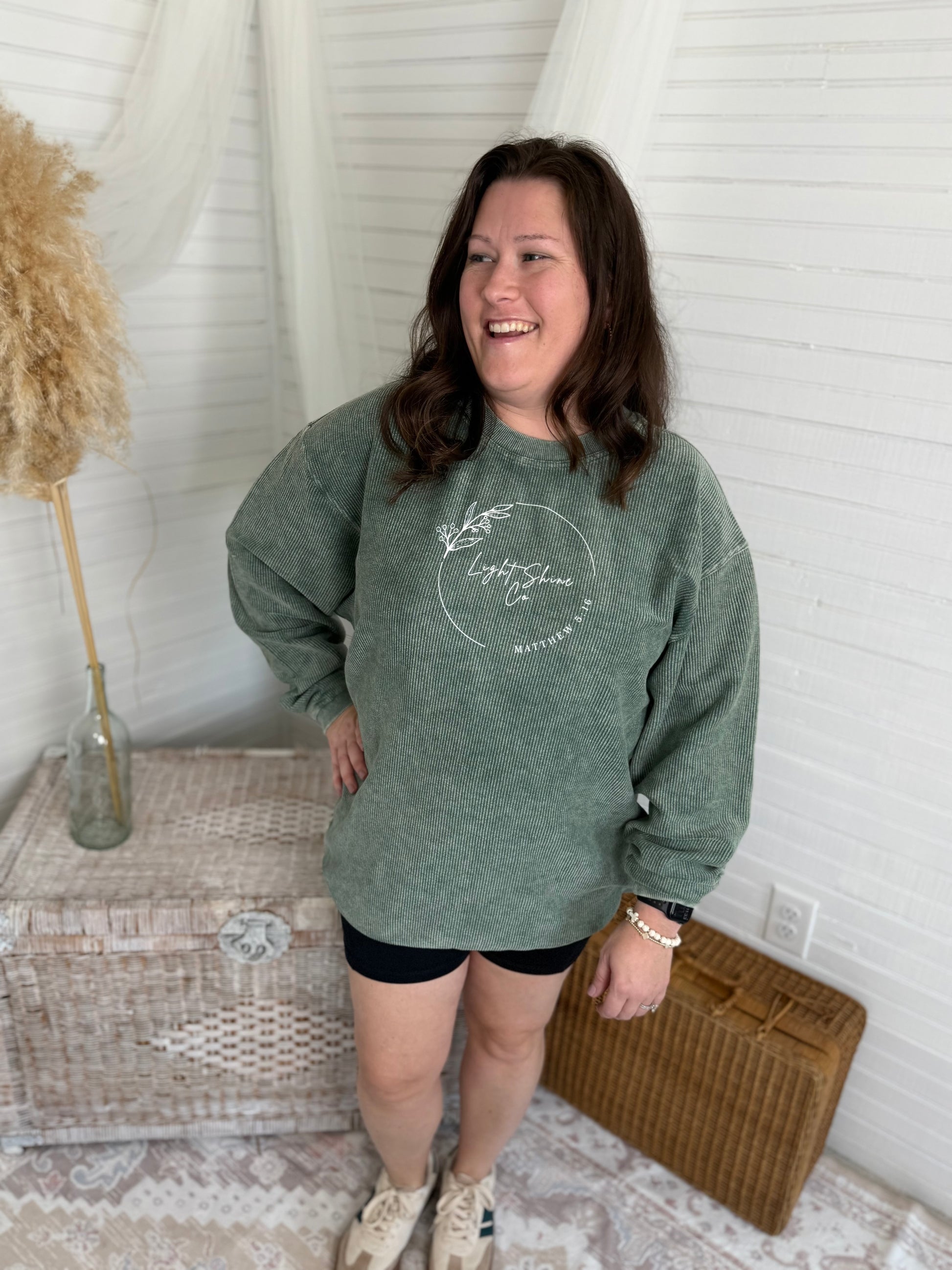 Meet our original custom logo crew, crafted from cozy vintage-washed corded fabric with a comfy ribbed neckline and cuffed hem. It features our store logo and verse on the front, rocking an oversized fit that’s light enough to wear all year. This Chicka-d brand gem scores a perfect 10/10 for quality, and the fresh green color is just right for fall vibes.