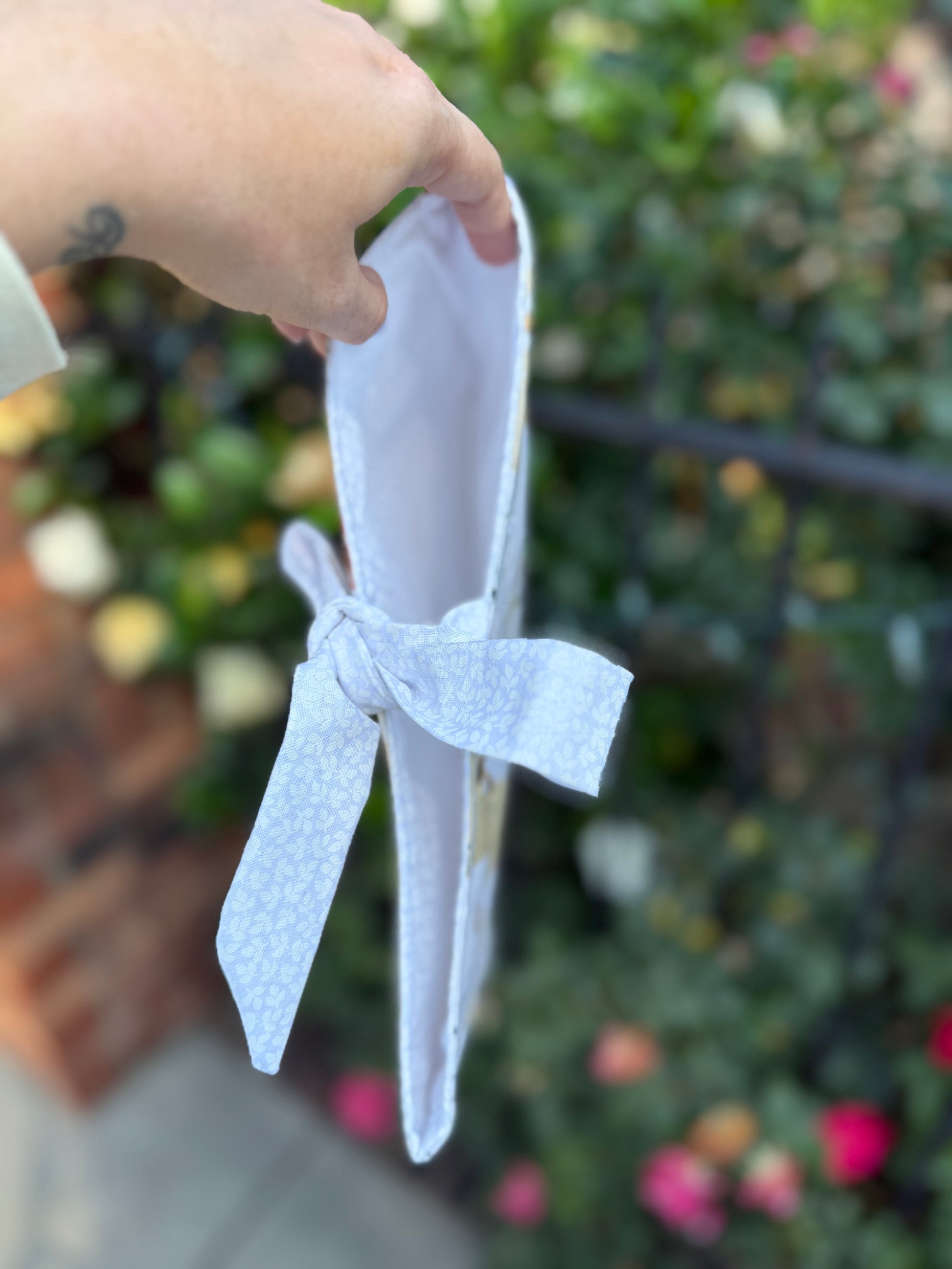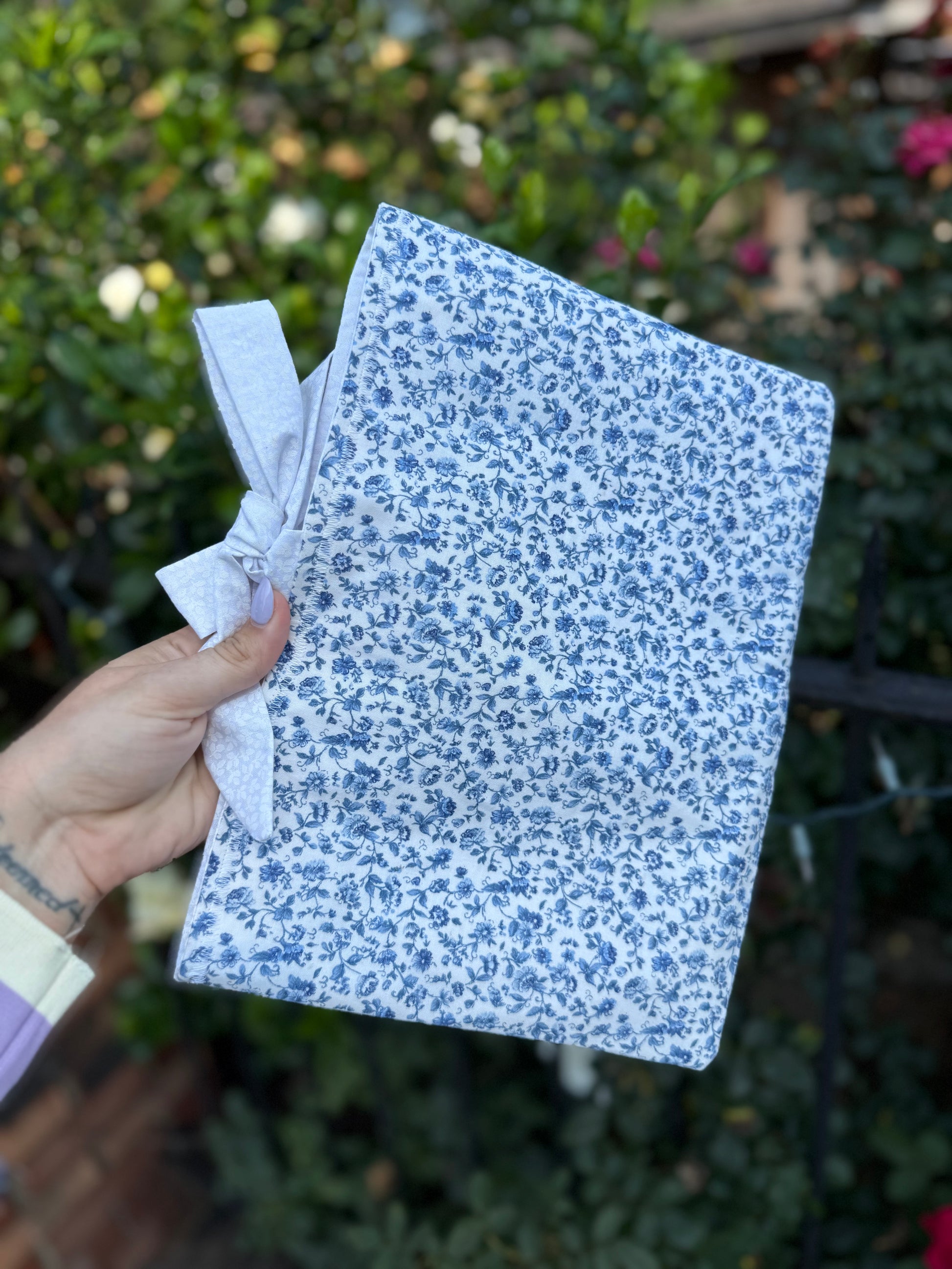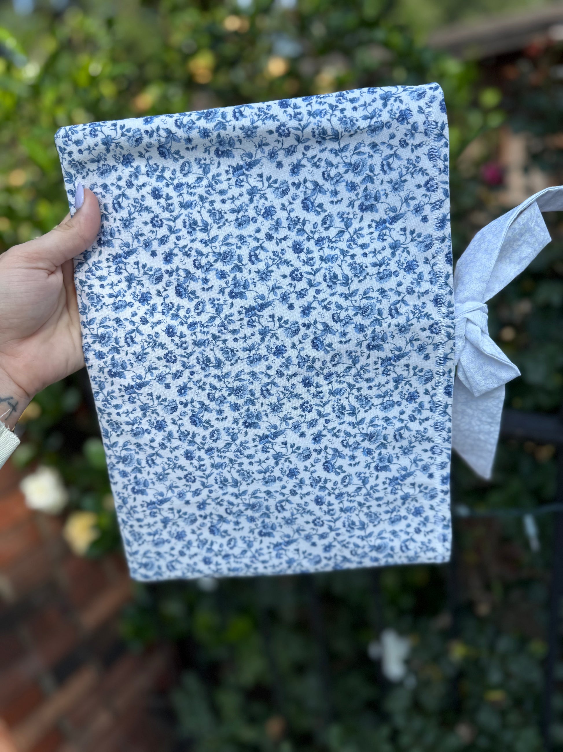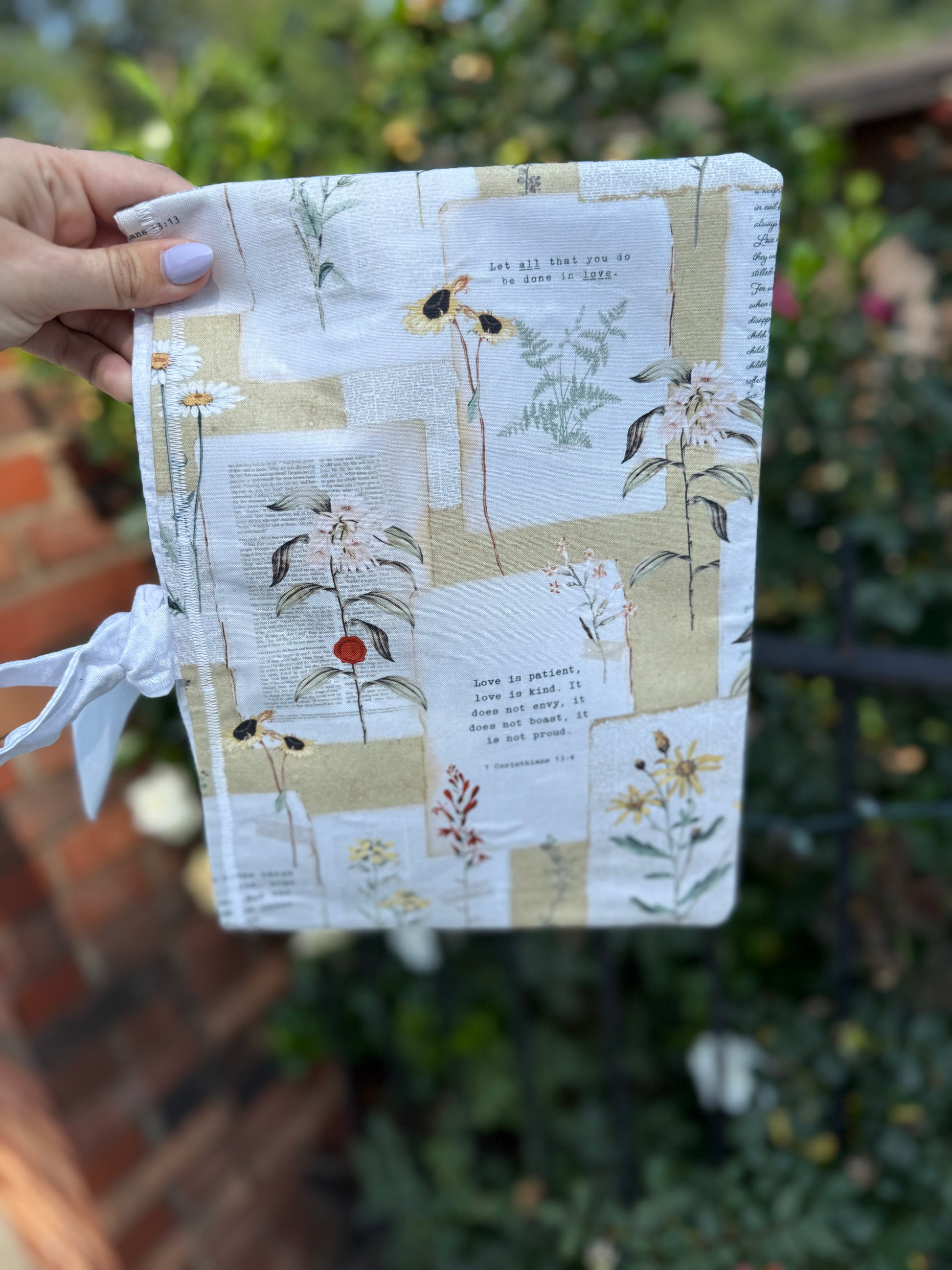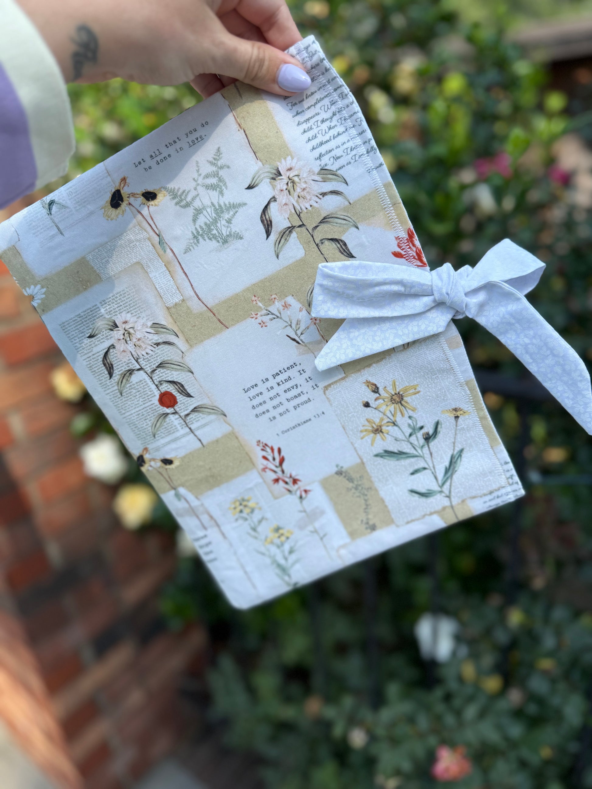 These adorable Bible covers are custom-made and are the perfect addition to your quiet time. They can be paired with your Bible or any book you want to take on the go. They are made from a sturdy fabric and have a tie enclosure. They come in one size and in two fabric designs, a blue floral pattern and a yellow faith-based design.