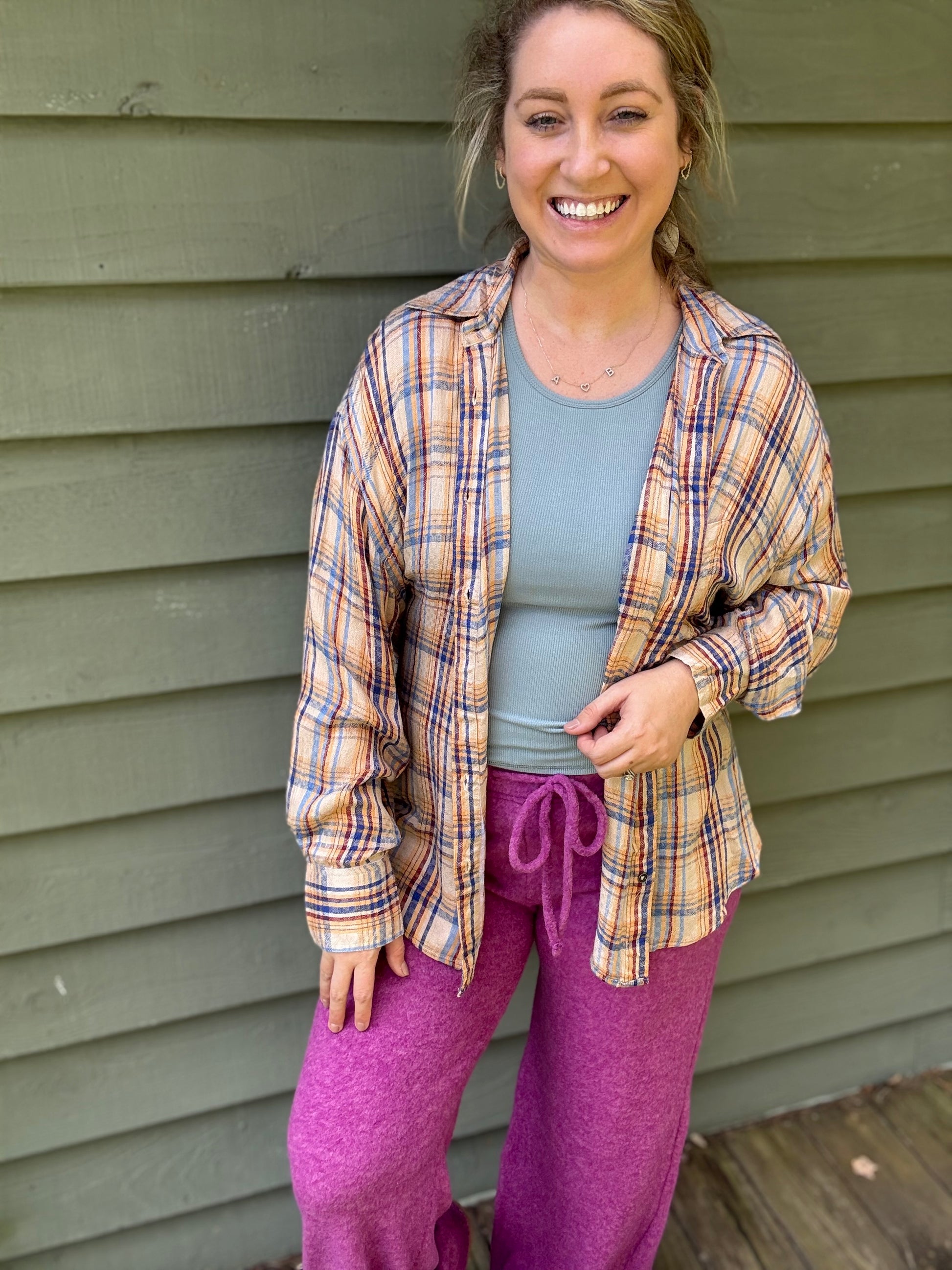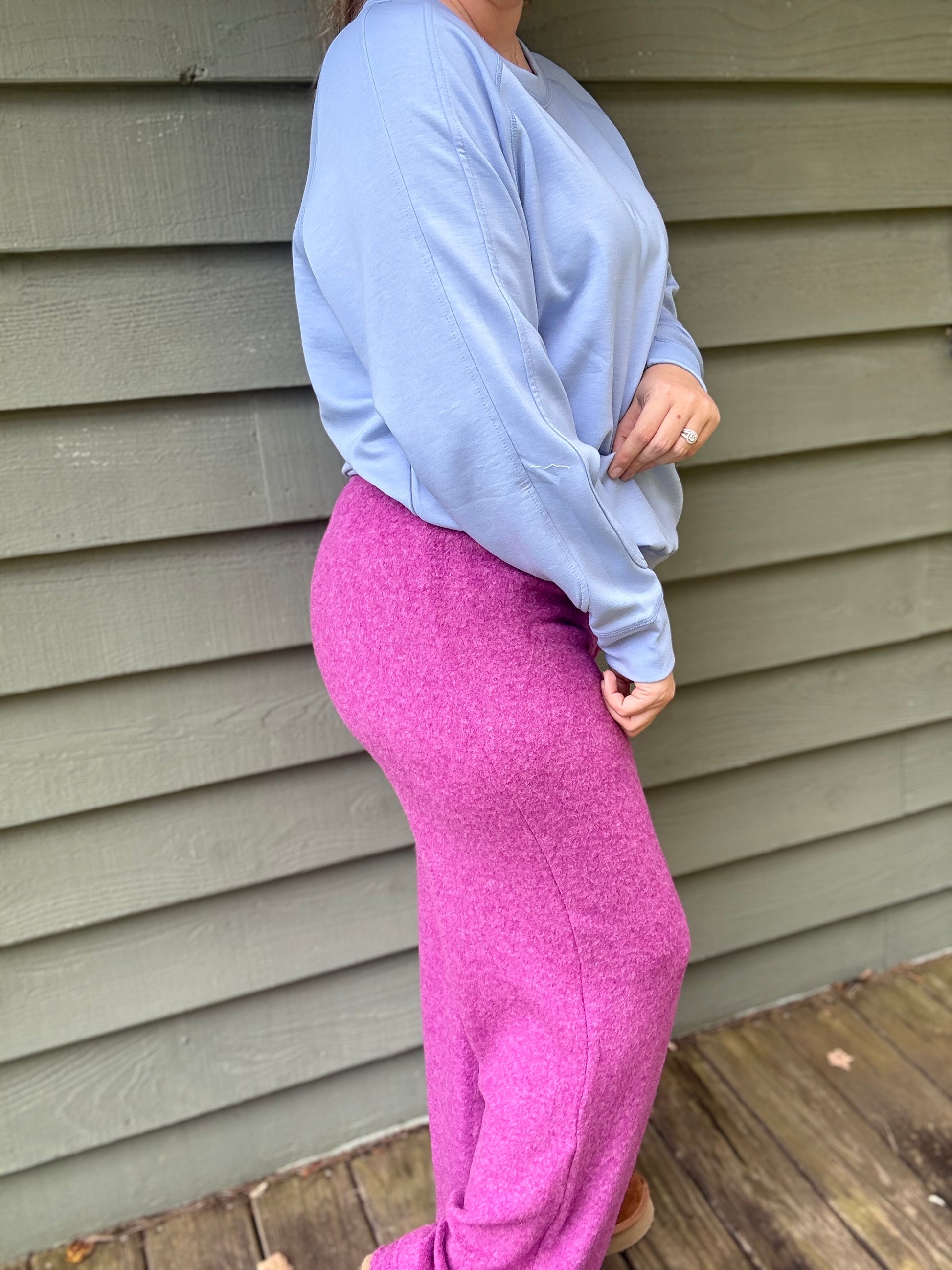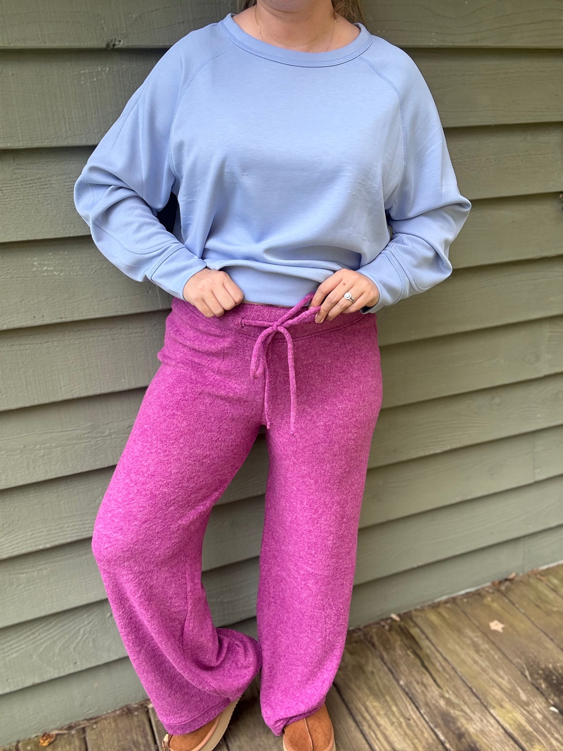 These Hacci brushed lounge pants will be your new favorite for those fall nights or cozy mornings. They are soft, stretchy and flattering. They come with an elastic waistband, drawstring and a wide leg style. You won’t want to take these off (trust us 😉)