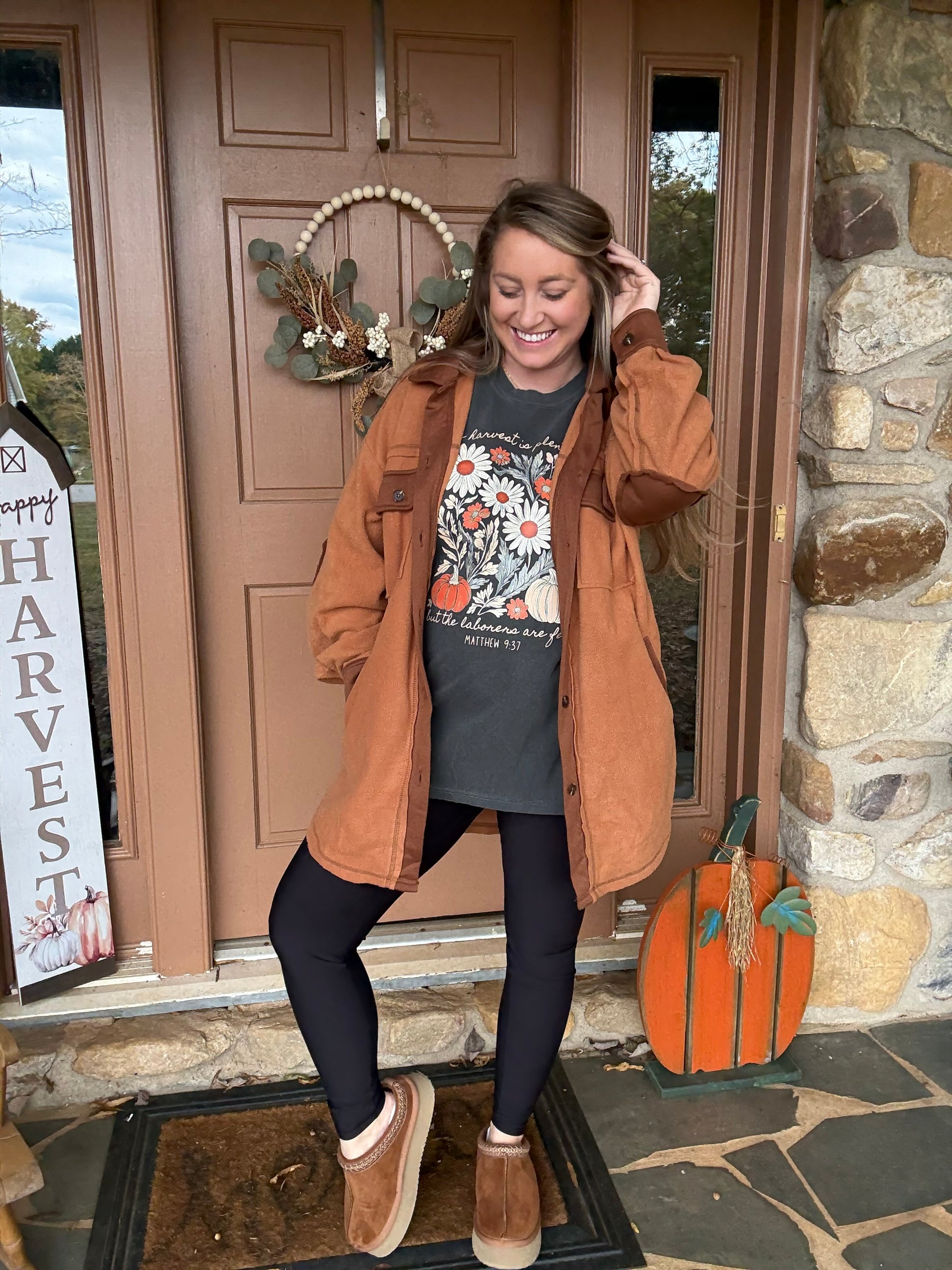 This shacket is just as soft as it is cute. It is perfect for layering and can easily be dressed up or down. It has an oversized fit and functional pockets and buttons with an adorable elbow patch detail. It is a beautiful camel color and pairs perfectly with our new Harvest Tee.