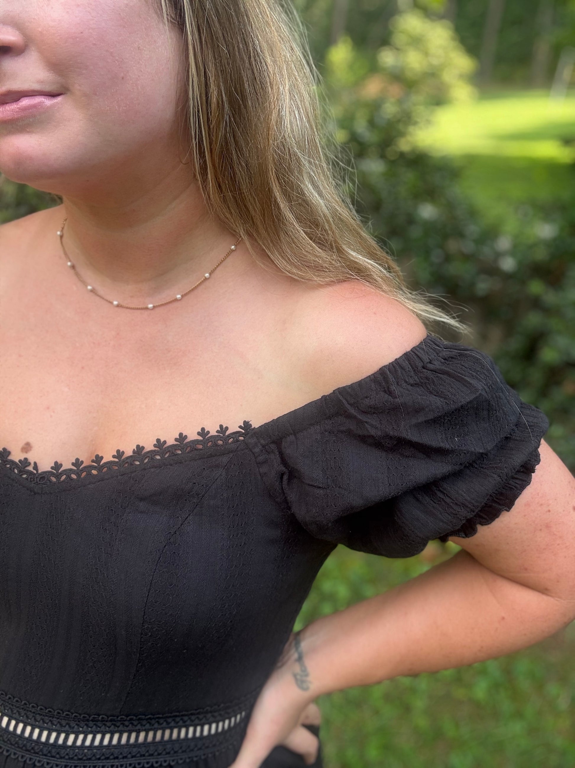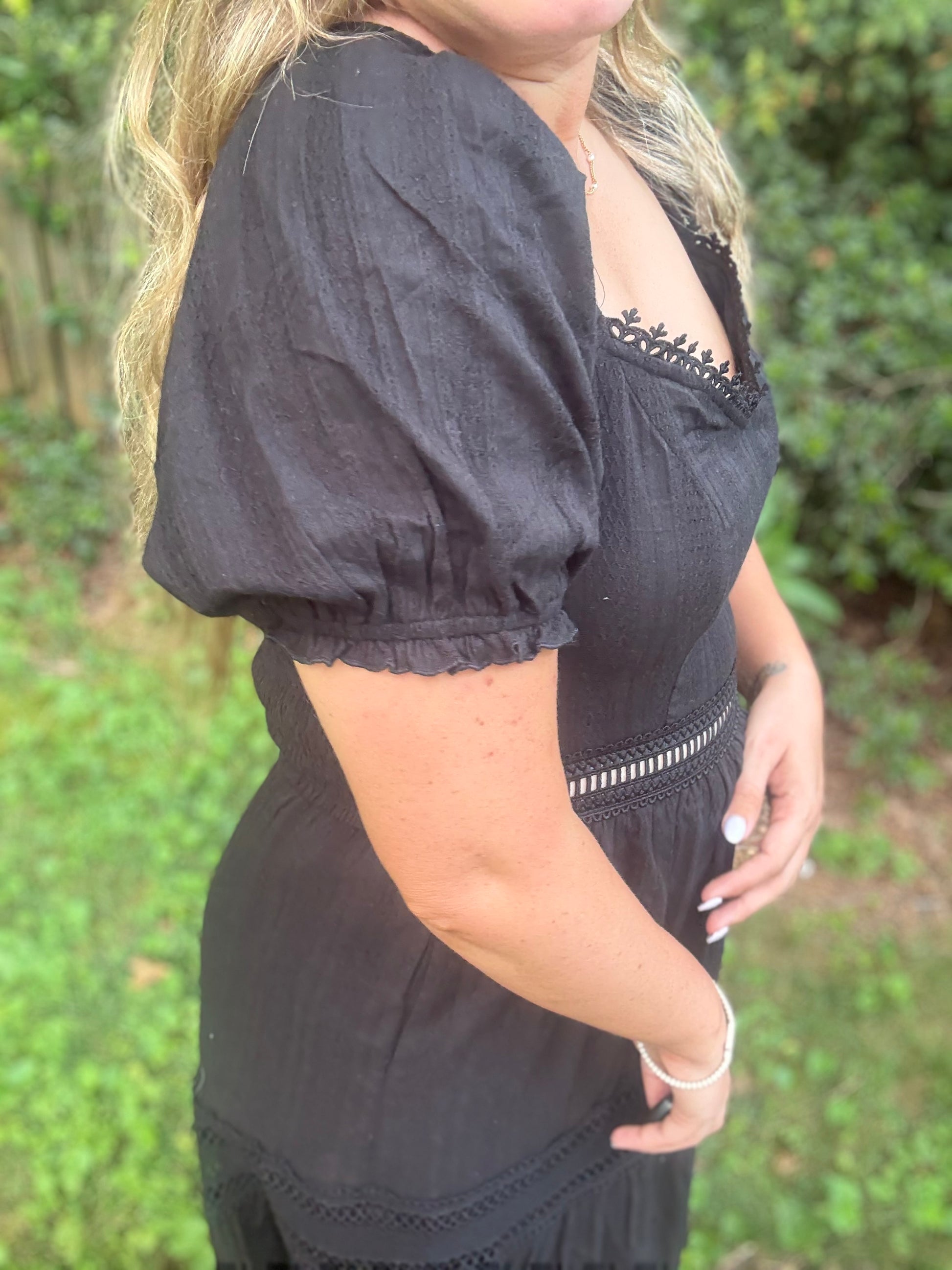 This stunning black dress is a must-have classic for your wardrobe. Ideal for all occasions, it features charming crochet lace embroidery and puff sleeves that you can style on or off the shoulder. With a flirty crochet detail beneath the bust, a smocked back, and a double lining, it radiates a sweet, romantic charm.