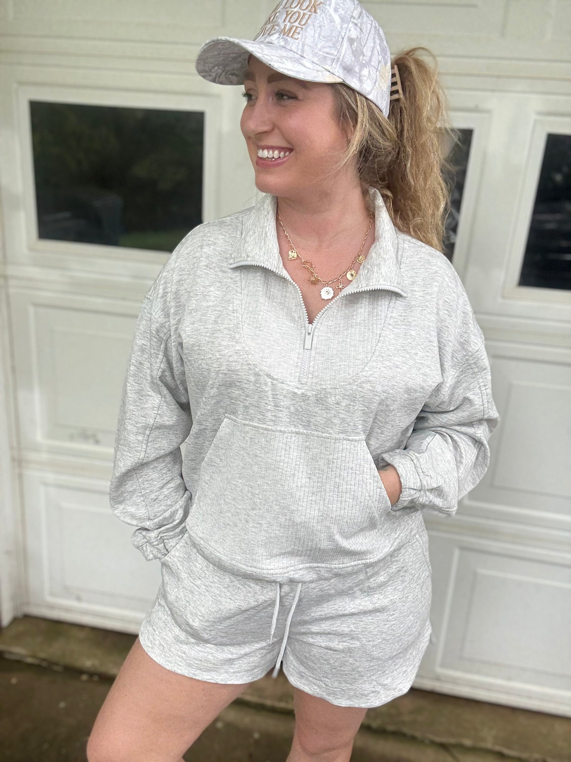 This two piece set is the perfect grab and go outfit. It features a lightweight scuba pullover with matching shorts. The pullover has a drawstring detail which gives you the option to singe it in for a more flattering or cropped look or leave it boxy. It has a kangaroo pocket and beautiful ribbed detail. The shorts have functional pockets with an elastic waist and drawstring.