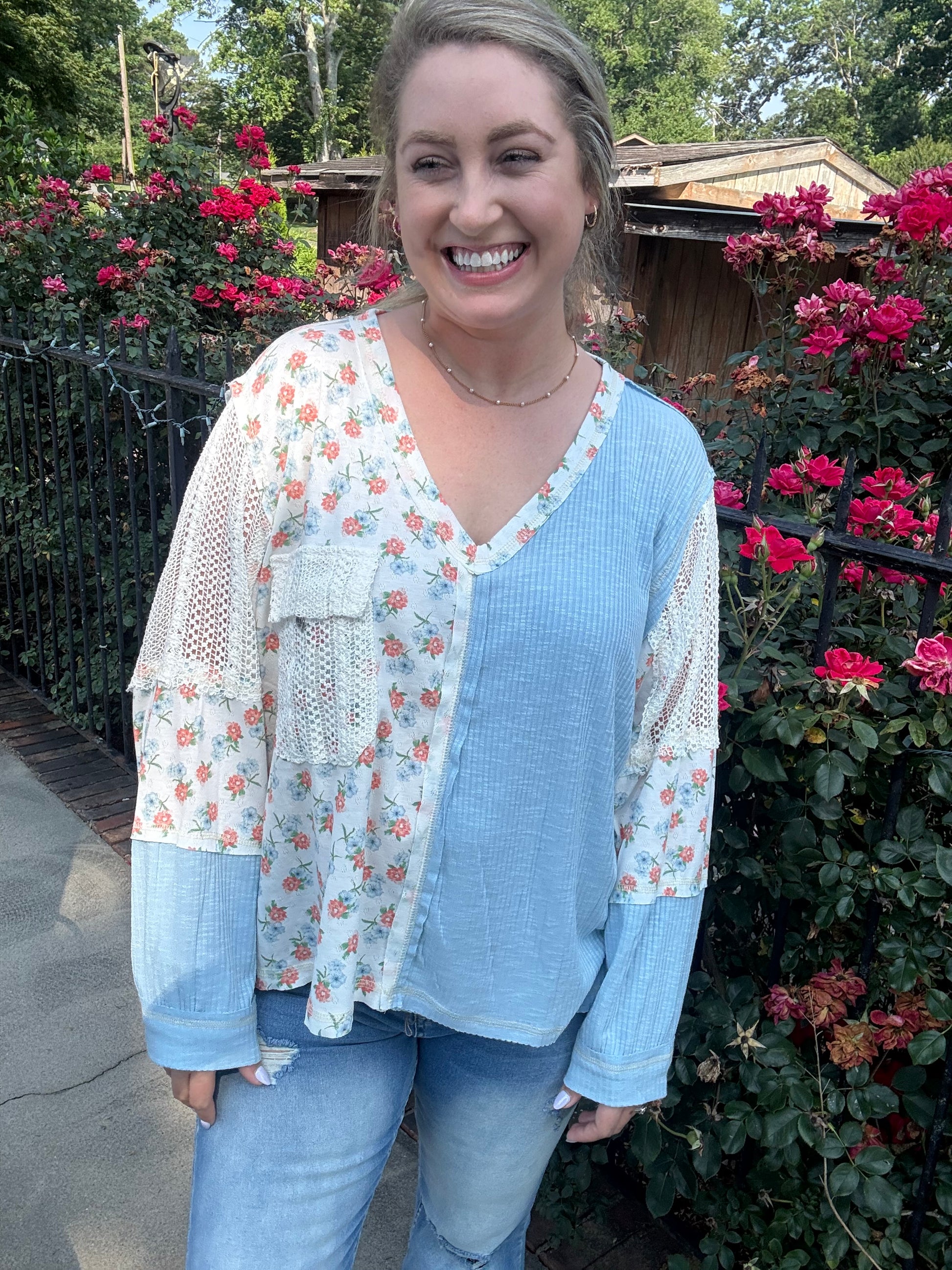 TThis gorgeous floral top is sure to become your favorite go-to. Featuring a V-neck, long sleeves, and a relaxed fit crafted from ribbed jersey, it’s accented with contrasting fabric panels. The lovely floral print blends perfectly with white netting and robin’s egg blue hues. Whether you’re dressing it up or pairing it with shorts for a casual vibe, this lightweight top offers both comfort and style with a flattering touch.