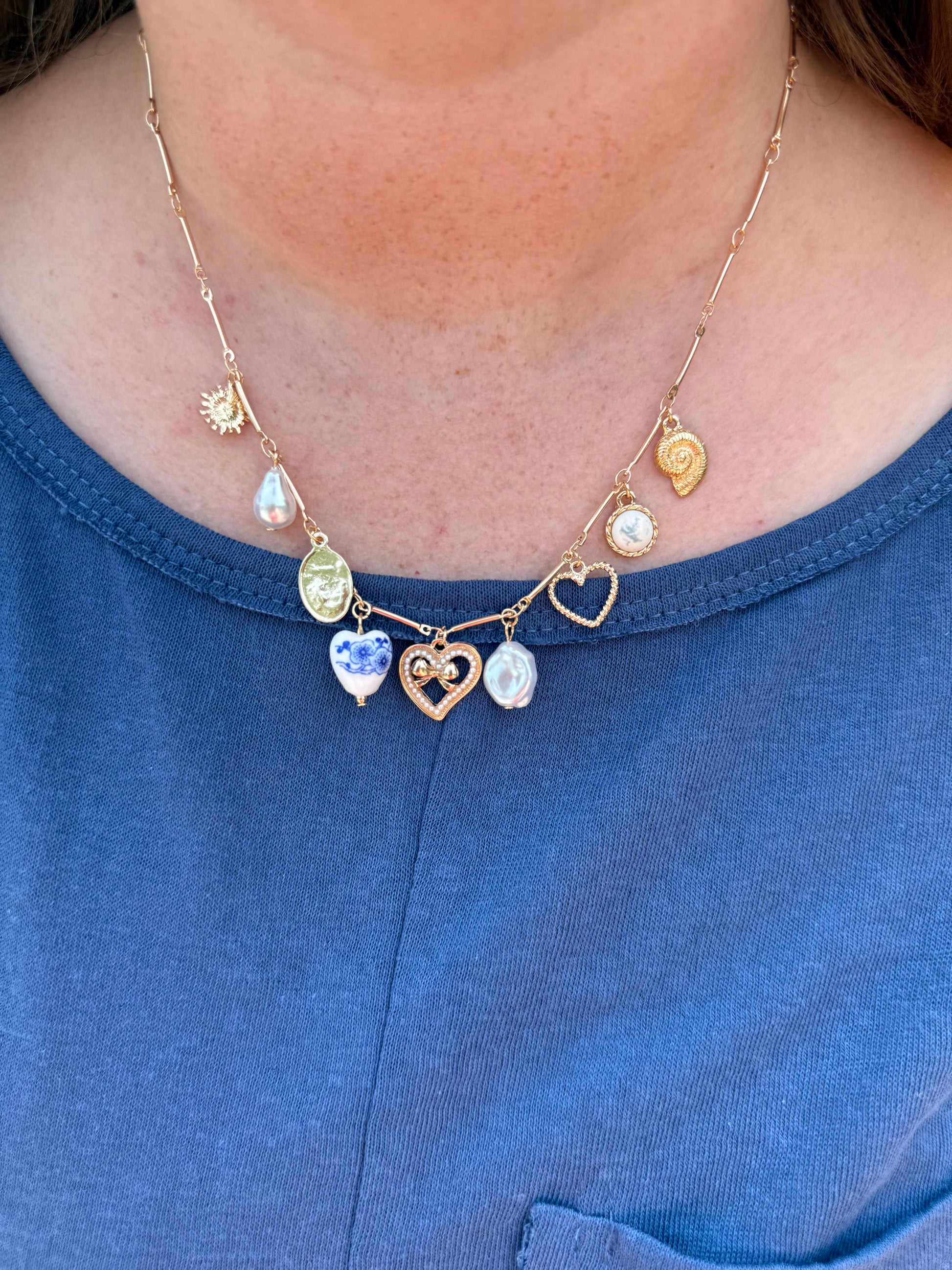 Charm Necklace, featuring Ceramic Porcelain Heart, lustrous Pearl, a blend of vintage charm with timeless designs. This unique piece adds a touch of romance and sophistication, making it for a balanced and graceful look.