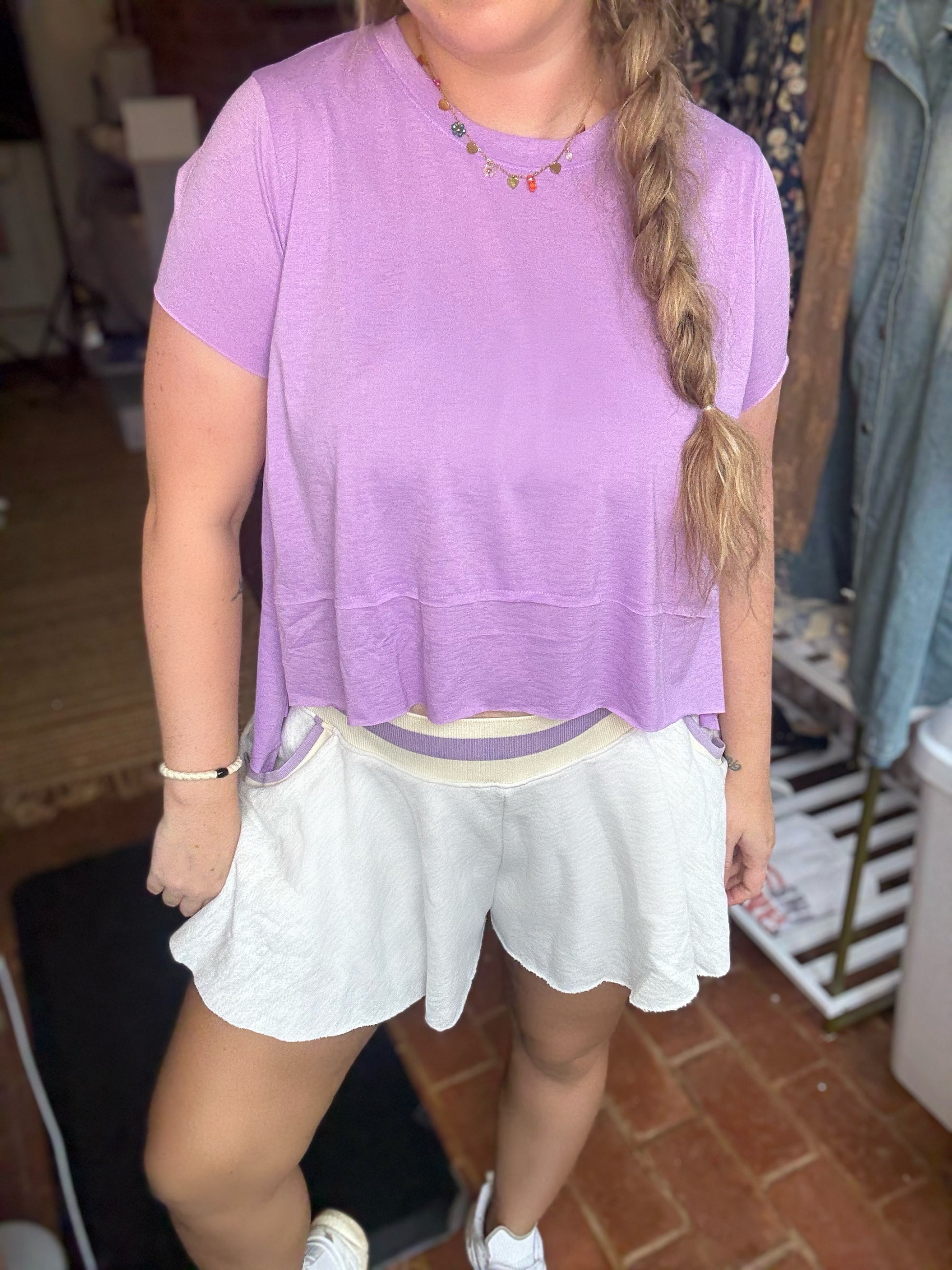 This adorable athleisure top has a shark bite design that is flattering on all body types. It has a light and airy athletic material, perfect for those hot days or sweaty workouts. This is a top you can dress up or down. This has a tts but flowy fit.
