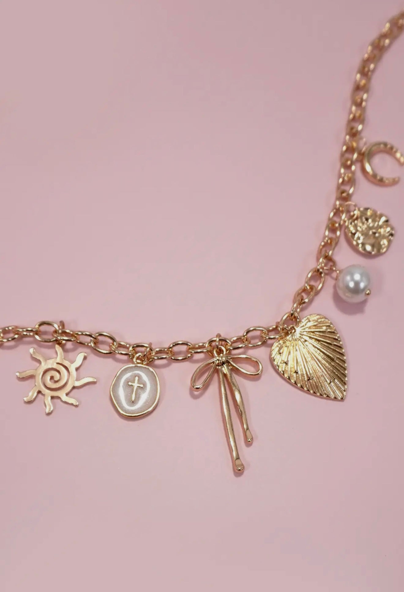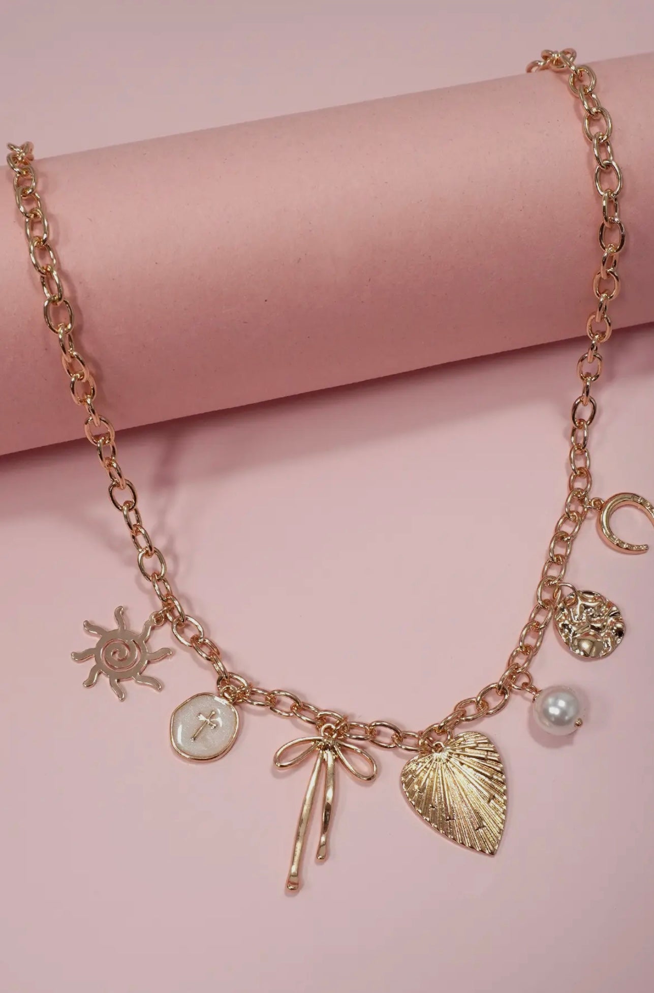 The Sun Bow Pearl Cross Disc U Charm Necklace, this intricate piece features an eclectic mix of charms, including a radiant sun, a delicate bow, a classic pearl, a symbolic cross, and a sleek disc, all connected by a stylish U-shaped charm. The combination of these diverse elements creates a unique and eye-catching necklace that blends modern elegance with timeless charm. This piece is anti tarnish.