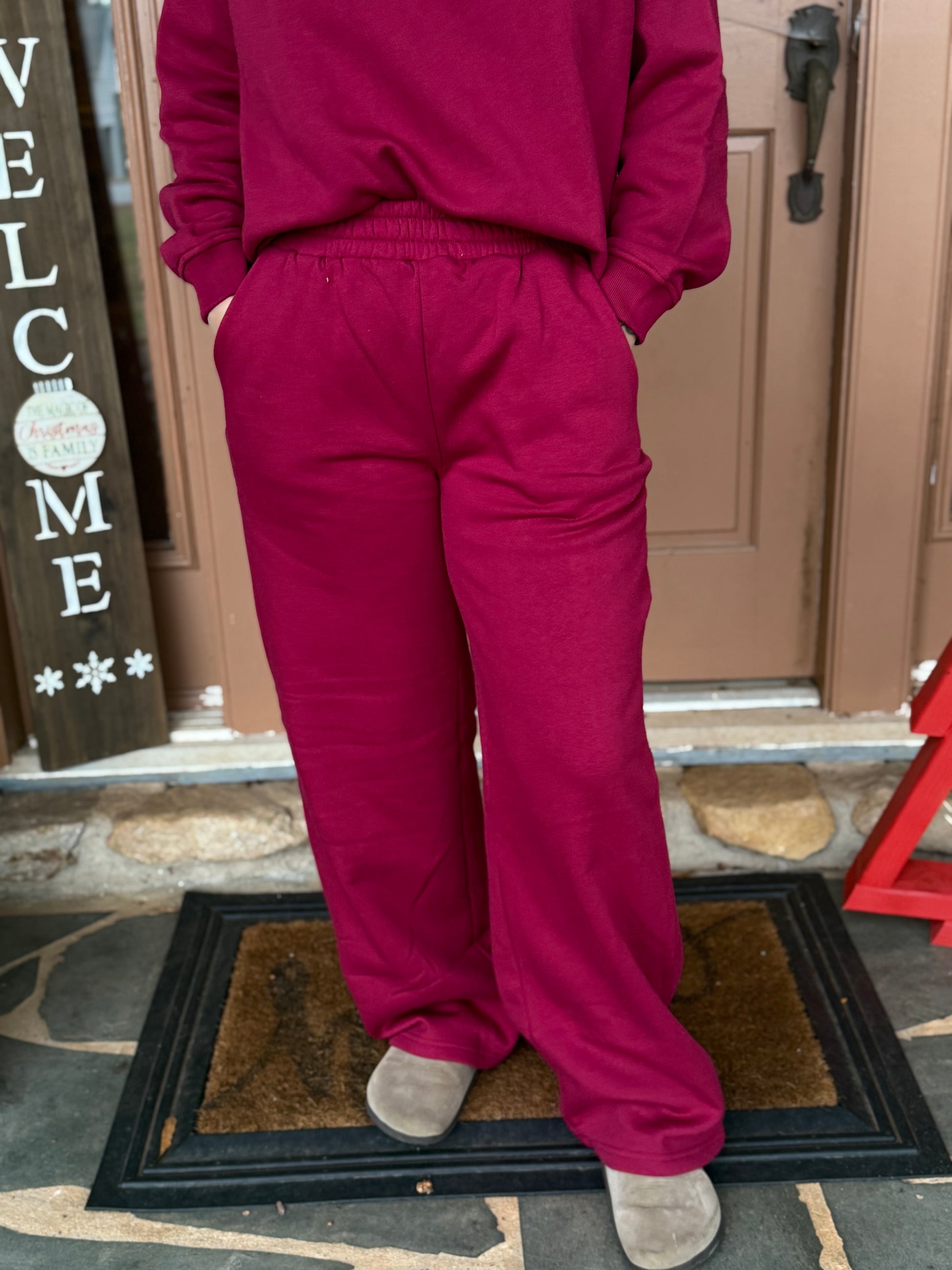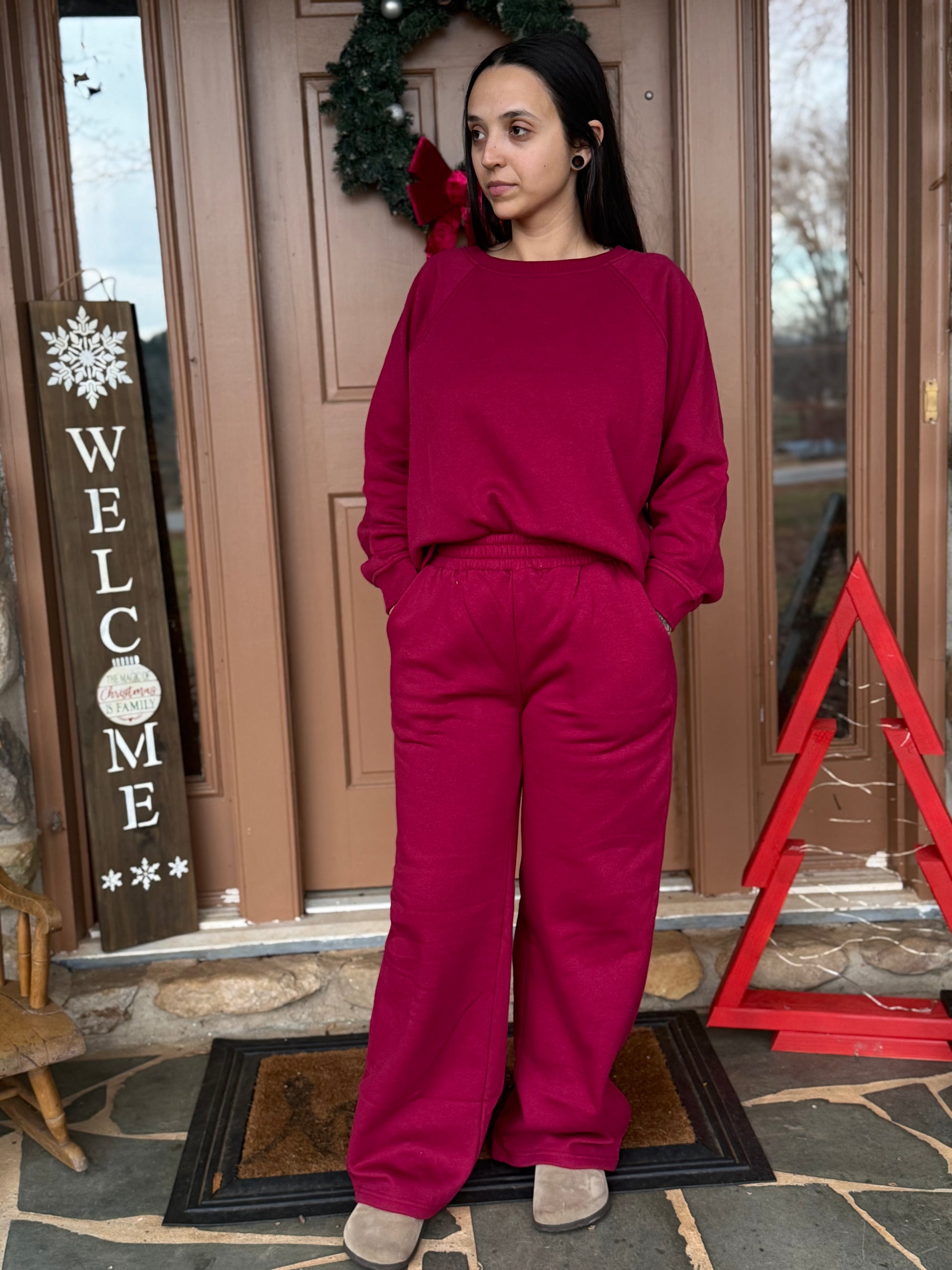 This set comes with both pieces and is sure to keep you warm and also cute at the same time. It is a great fit to lounge around the house in but also thick enough to pair with your favorite trucker hat and head out the door. It has mid rise, wide leg bottoms with functional pocket’s and a matching pullover top.