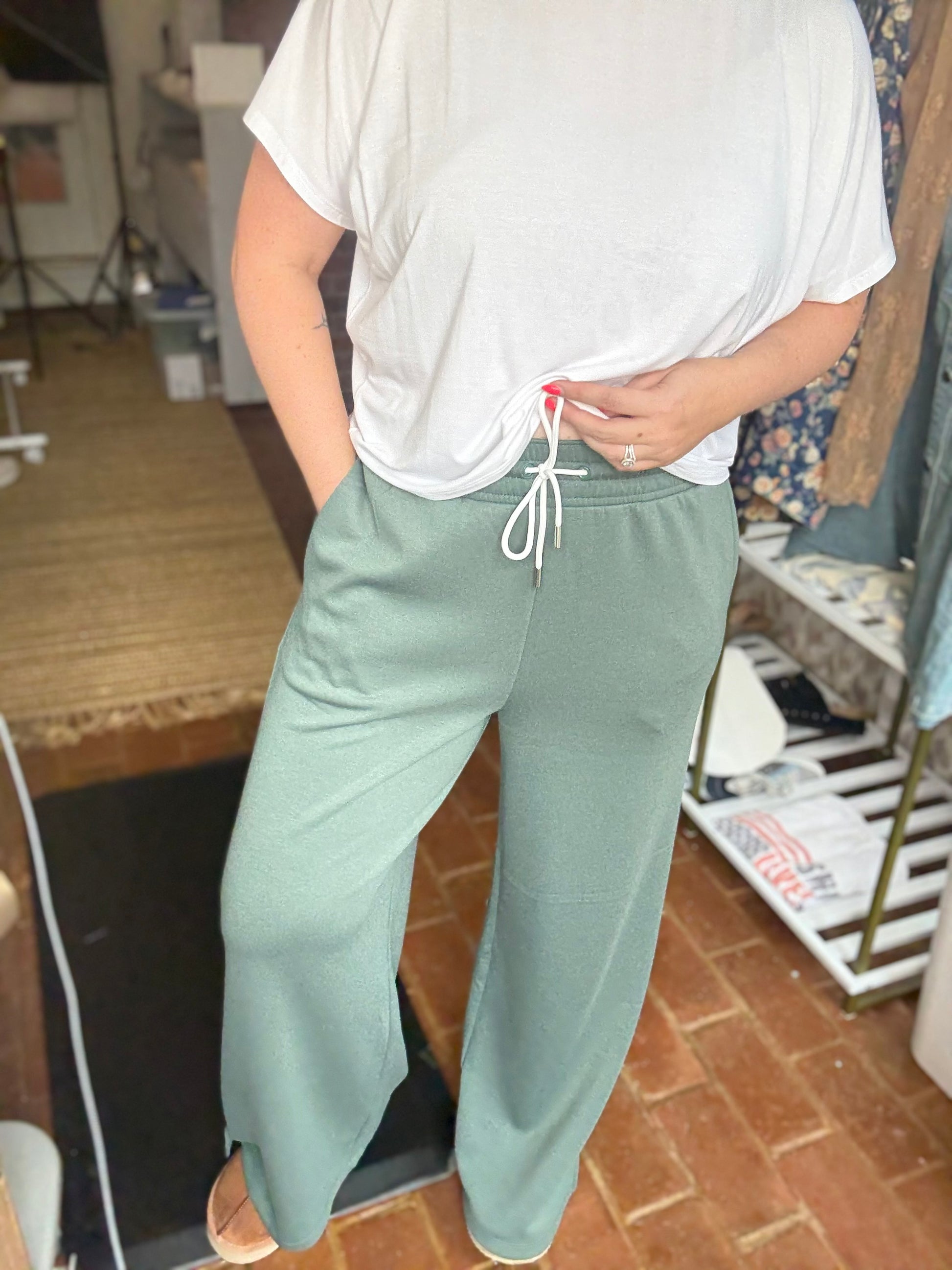 These lightweight high waisted scuba lounge pants come in a beautiful jade color which is perfect for fall. They have a white drawstring and adjustable waistband as well as functional pockets with wide legs. These pants are ones you won’t want to take off once you put them on. We have them paired with our new On the Go tee in white for a cute loungy look.