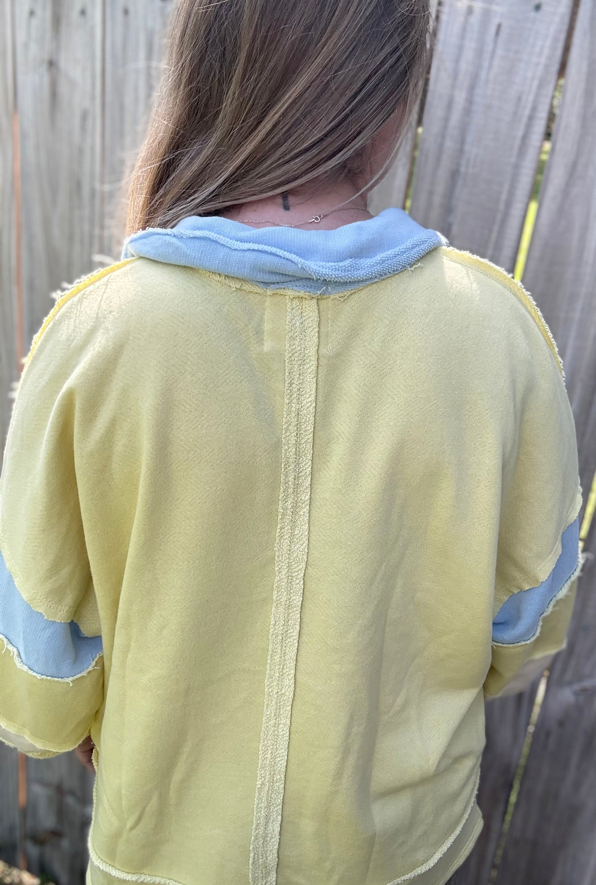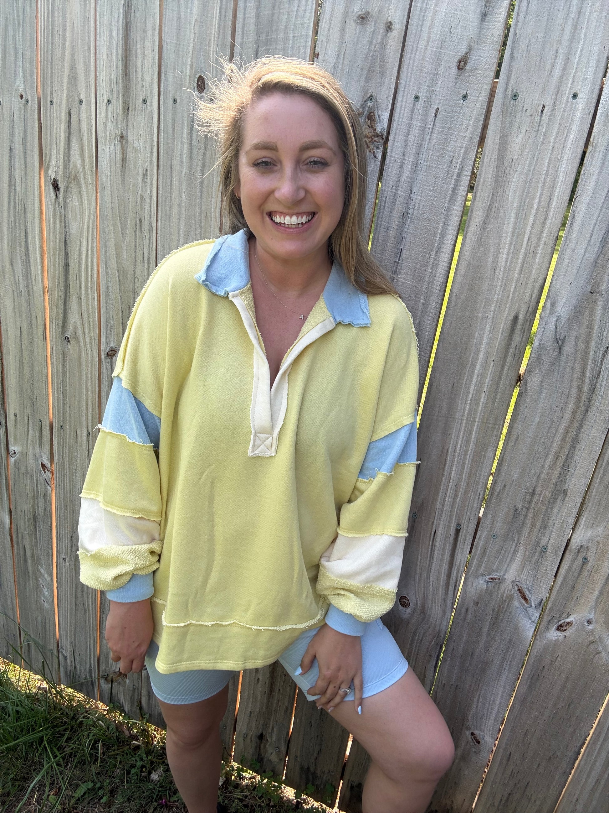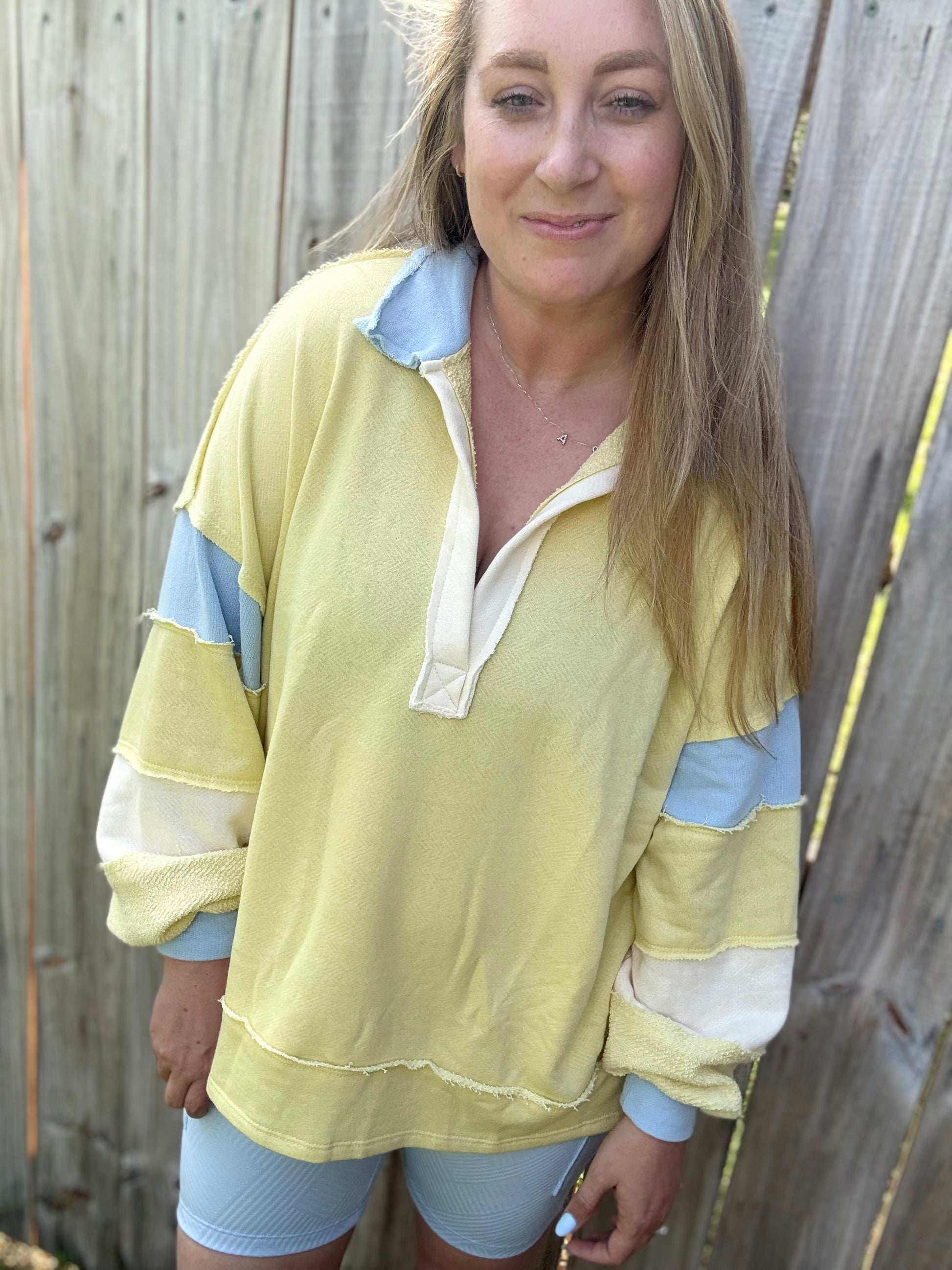 This adorable French Terry Color-block Collared Loose Fit Top is perfect for Spring and Summer. It features a beautiful butter yellow and sky blue color. The pullover is lightweight, has a raw hem detail and a Henley style with contrasting color block details.