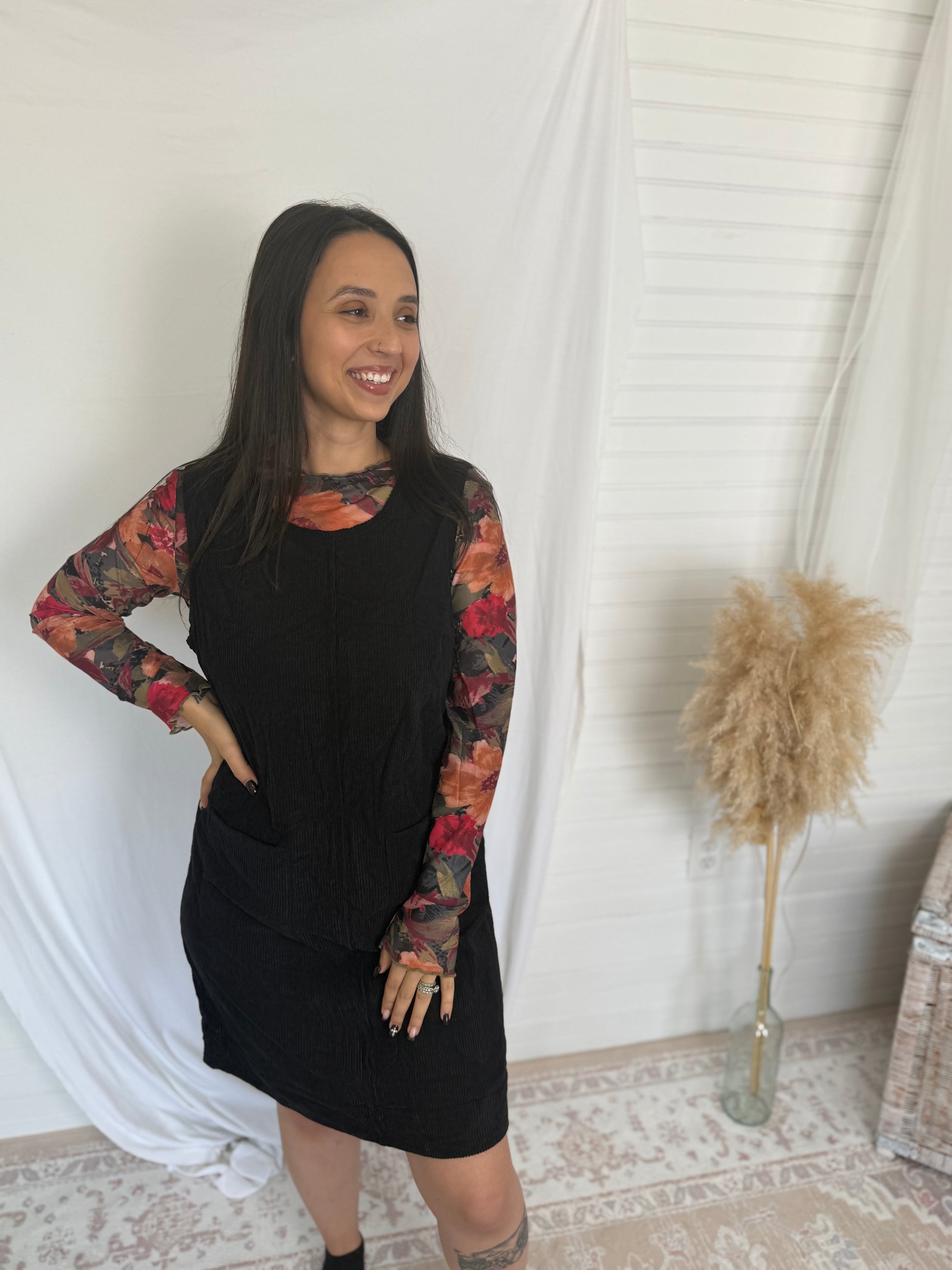 This adorable and soft corduroy jumper is sure to be a closet staple. It is made from a lightweight ribbed material and has functional pockets and a flattering lower back. It pairs perfectly with our new Fall Floral Mesh top or any lace undershirt or long sleeve you’d like to use. You could even wear it on its own with your favorite jacket. This would be the cutest Thanksgiving fit.