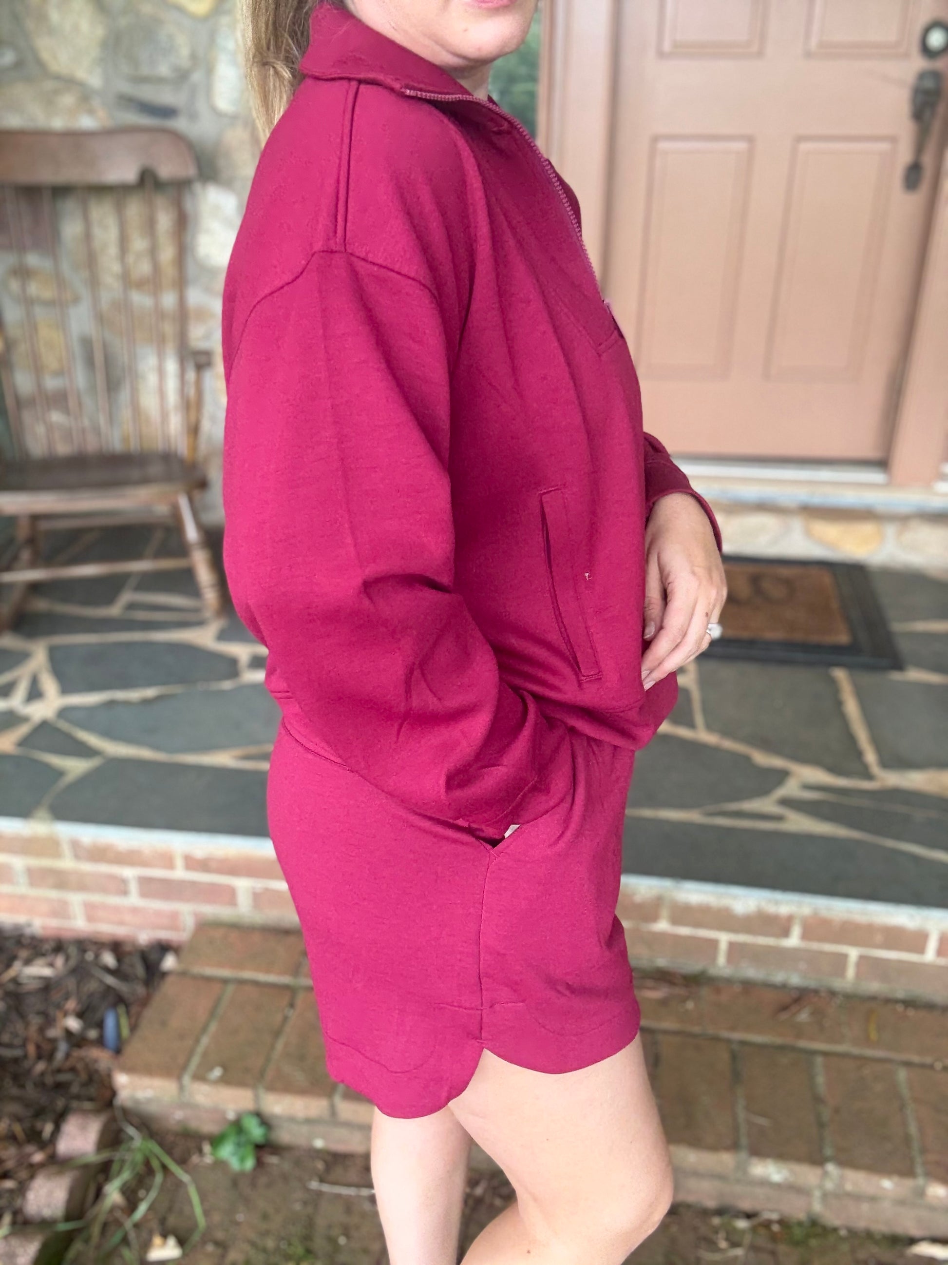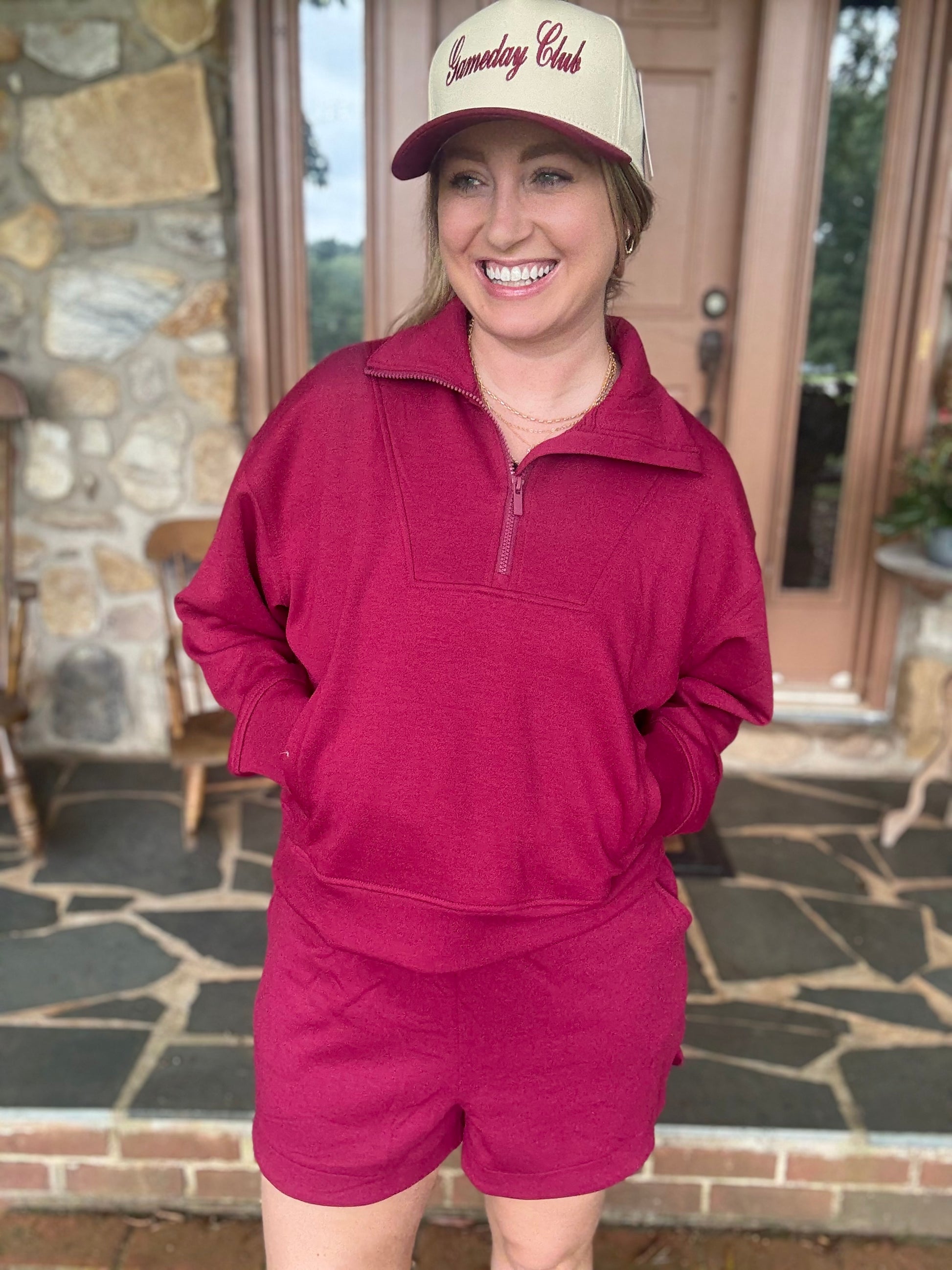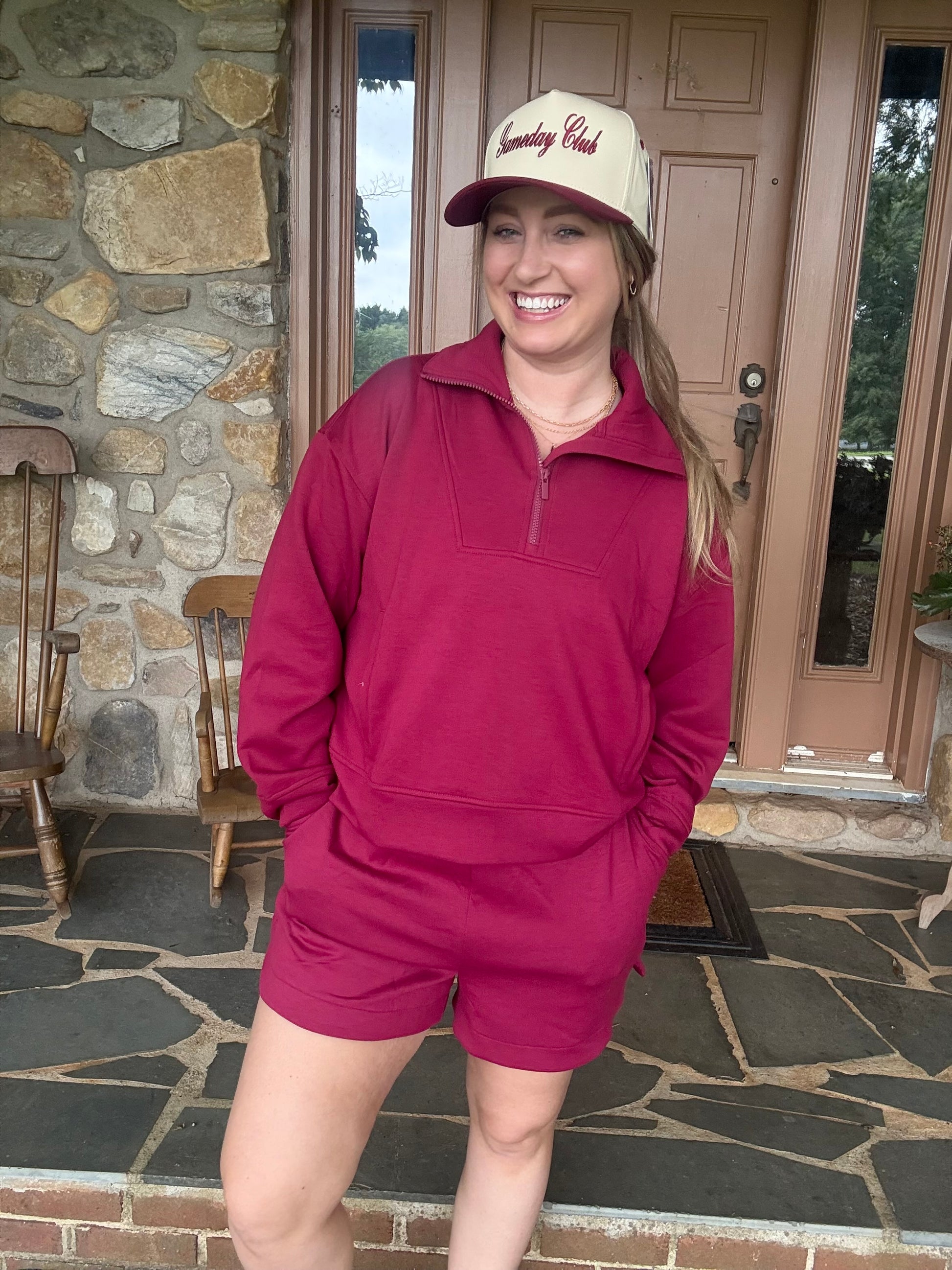 This adorable burgundy set is perfect for those game days where you want to be comfortable but cute. This set is lightweight and has a pullover top with functional kangaroo pocket and matching drawstring shorts that are pocketed as well. This set is the perfect color for fall