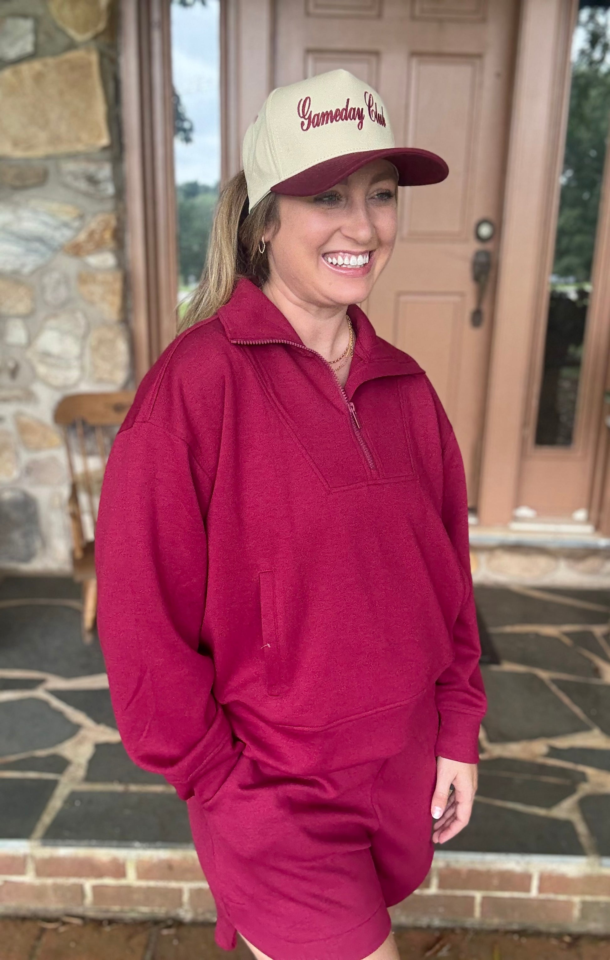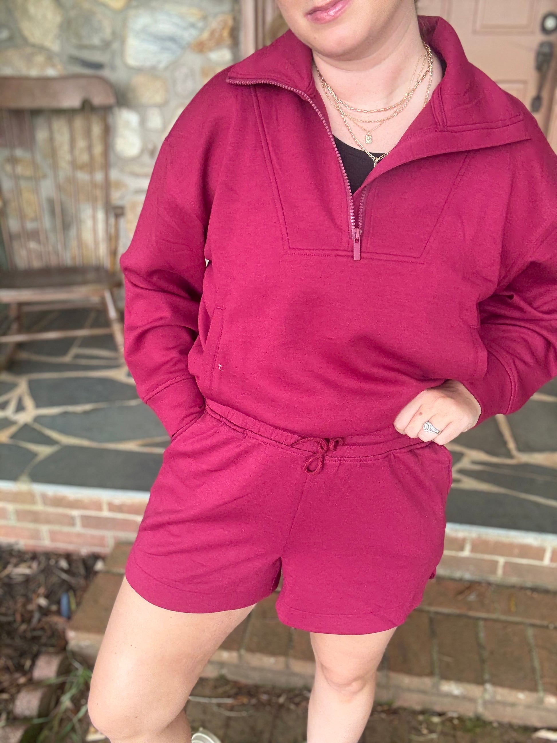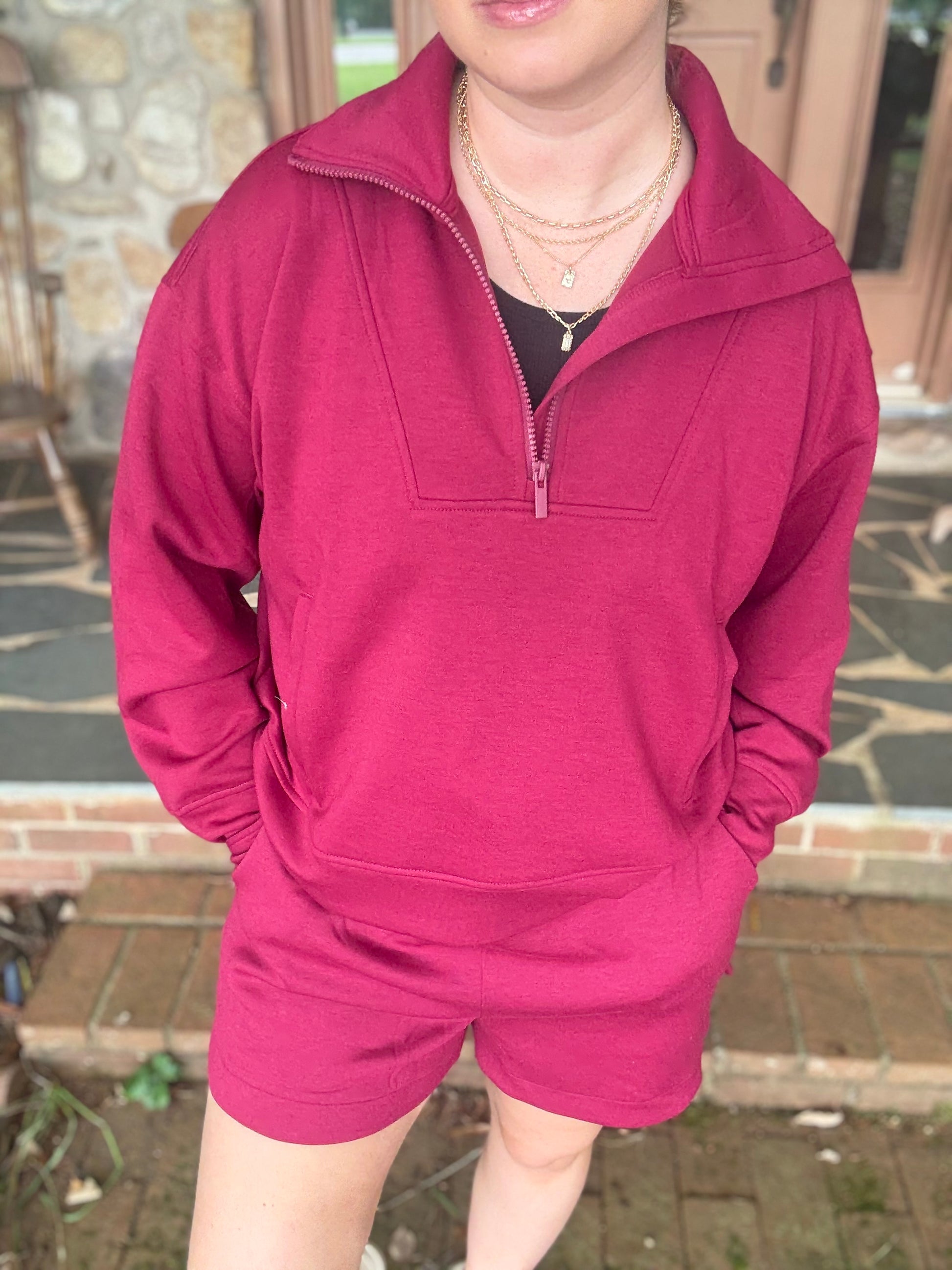 This adorable burgundy set is perfect for those game days where you want to be comfortable but cute. This set is lightweight and has a pullover top with functional kangaroo pocket and matching drawstring shorts that are pocketed as well. This set is the perfect color for fall
